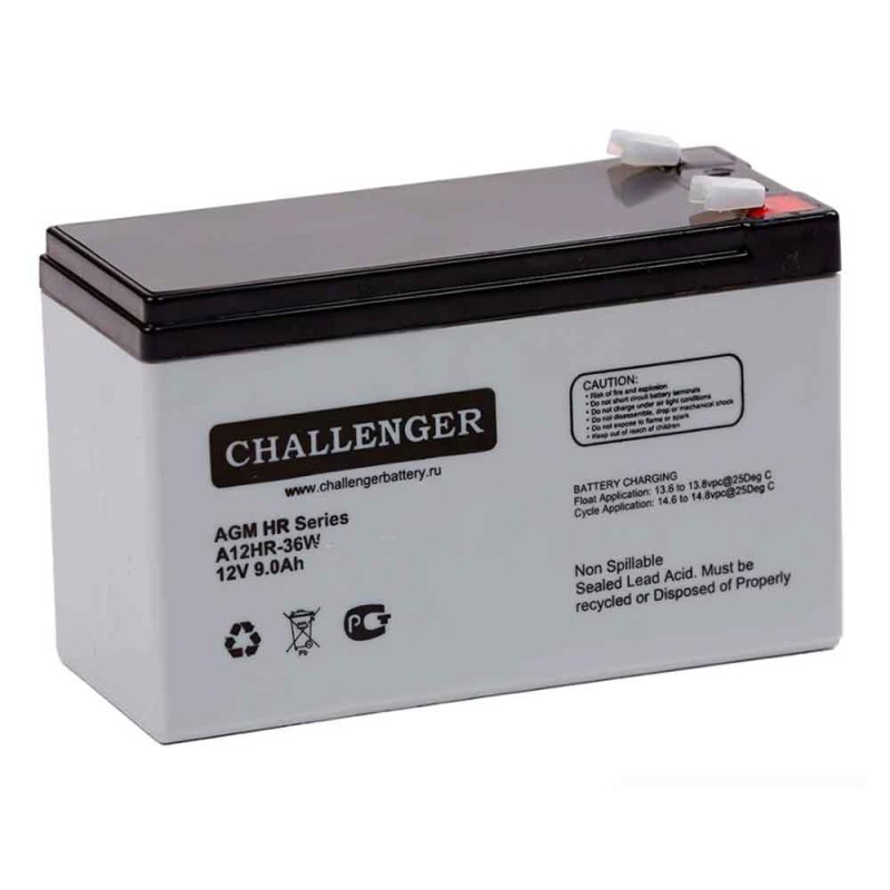 **Аккумулятор CHALLENGER A12HR 36W (12V / 9Ah)**Свинцово-кислотный аккумулятор CHALLENGER A12HR 36W (9 Ач, 12 В) производится для ИБП, систем безопасности, медицинского оборудования, систем связи и альтернативной энергетике. Корпус из ABS пластика герметичен, на крышке предусмотрен клапан избыточного давления. Жидкий электролит удерживается внутри мелкопористых стекловолоконных сепараторов (технология AGM). Срок службы CHALLENGER A12HR 36W при правильной эксплуатации достигает 5 лет. Дата производства аккумулятора CHALLENGER A12HR 36W указана на крышке в виде символьного кода. Технические характеристики АКБ CHALLENGER A12HR 36W Номинальное напряжение 12 В Число элементов 6 Максимальный разрядный ток (25 °С) 90 А (5 с) Внутреннее сопротивление полностью заряженной батареи (25 °С) 22 мОм Саморазряд (при 20 °С) 3% в месяц Срок службы в буферном режиме 10 лет Циклический режим (- В) Максимальный зарядный ток 2.7 А Температурная компенсация - Буферный режим (- В) Температурная компенсация - Диапазон рабочих температур Оптимальная рабочая температура +20–25 °С Разряд -20 °С ~ +40 °С Заряд -20 °С ~ +40 °С Хранение -20 °С ~ +40 °С Конструкция аккумулятора CHALLENGER A12HR 36W Компонент Материал Положительная пластина Диоксид свинца Отрицательная пластина Свинец Корпус и крышка Синтетическая смола ABS Клапан предохранительный Каучук Клеммы Медь Сепаратор Стекловолокно Электролит Серная кислота Особенности аккумулятора CHALLENGER A12HR 36W Низкий саморазряд — менее 3% в месяц Технология AGM (электролит абсорбирован в стекловолоконных сепараторах) Корпус из ABS-пластика с регулирующим клапаном Работа в режиме циклического и постоянного заряда Срок службы 5 лет Применение аккумулятора CHALLENGER A12HR 36W Источники бесперебойного питания Медицинское оборудование Безопасность Системы связи Альтернативная энергетика Разряд постоянным током, А (при 25 °С) АКБ CHALLENGER A12HR 36W Конечное напряжение, В/эл. 3 мин 5 мин 8 мин 10 мин 15 мин 20 мин 30 мин 1 ч 1.5 ч 1.6 46.94 41.26 32.97 28.26 20.85 16.39 11.68 6.548 4.642 1.65 42.6 37.44 30.15 26.05 19.5 15.47 11.06 6.241 4.443 1.7 40.76 35.83 28.95 25.11 18.9 15.06 10.79 6.105 4.36 1.75 37.75 33.19 26.97 23.53 17.85 14.3 10.34 5.9 4.228 1.8 34.58 30.4 24.93 21.95 16.95 13.63 9.889 5.679 4.078 1.85 29.57 25.99 21.24 18.63 14.54 11.84 8.745 5.133 3.73 Разряд постоянной мощностью, А (при 25 °С) АКБ CHALLENGER A12HR 36W Конечное напряжение, В/эл. 3 мин 5 мин 8 мин 10 мин 15 мин 20 мин 30 мин 1 ч 1.5 ч 1.6 84.36 74.16 59.46 51.16 38.1 30.17 21.58 12.28 8.787 1.65 77.51 68.13 55.11 47.84 36 28.79 20.78 11.82 8.488 1.7 74.84 65.79 53.34 46.42 35.25 28.18 20.29 11.63 8.356 1.75 70 61.53 50.25 44.05 33.6 27.11 19.65 11.31 8.14 1.8 64.98 57.12 47.01 41.53 32.1 26.04 19 10.98 7.925 1.85 56.46 49.63 40.62 35.68 27.9 22.82 16.91 9.993 7.278 Транспортировка батареи Корпус Challenger A12HR 36W полностью герметичен, а значит аккумулятор безопасен во время транспортировки. Его допускается перевозить любым видом транспорта: автомобильным, железнодорожным, морским и воздушным. На крышке располагается клапан избыточного давления, для обеспечения его корректной работы запрещено транспортировать батарею в перевёрнутом состоянии. Перед отправкой необходимо убедиться, что Challenger A12HR 36W не имеет трещин, следов протекания электролита и других дефектов. Температура должна находиться в пределах от +20 до +25 °С, следите, чтобы аккумулятор не нагревался от прямого солнечного света и других источников тепла. Зафиксируйте батареи во избежание их падения и опрокидывания. Не размещайте ничего поверх Challenger A12HR 36W, аккумуляторы перевозятся на паллетах, уложенные в один ряд. Клеммы всегда находятся под напряжением, предусмотрите для них специальные защитные колпачки. Соблюдение вс