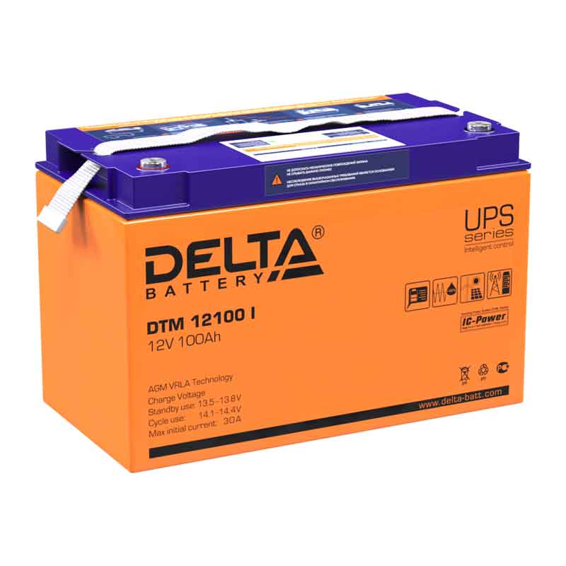 **Аккумулятор Delta DTM 12100 I (12V / 100Ah)**Универсальный свинцово-кислотный аккумулятор Delta DTM 12100 I успешно эксплуатируется как в буферном, так и в циклическом режимах. Cрок его службы составляет 10-12 лет. Рекомендован для применения в различных системах аварийного и бесперебойного питания, включая такие требовательные электрические приборы как импортные насосы и котлы систем отопления. Аккумуляторная батарея Delta DTM 12100 I выполнена по технологии AGM и имеет клапанное регулирование внутреннего давления (VRLA). Оборудована LCD дисплеем, отображающим состояние АКБ. Не подвержена утечке электролита, возможен единоразовый долив электролита, который идет в комплекте с батареей, под крышкой. Обладает высокими эксплуатационными характеристиками и соответствует всем современным требованиям к герметизированным батареям. Дата производства аккумулятора Delta DTM 12100 I указана на крышке в виде символьного кода. Технические характеристики АКБ DELTA DTM 12100 I Номинальное напряжение 12 В Число элементов 6 Максимальный разрядный ток (25 °С) 900 А (5 с) Внутреннее сопротивление полностью заряженной батареи (25 °С) 4 мОм Саморазряд (при 20 °С) 3% в месяц Срок службы в буферном режиме 10-12 лет Номинальная емкость (25 °С) 10 часовой разряд (10 А, 1,75 В/эл.) 100 Ач 5 часовой разряд (16.5 А, 1,75 В/эл.) 82.5 Ач 1 часовой разряд (62 А, 1,6 В/эл.) 62 Ач Циклический режим (2,3–2,35 В/эл) Максимальный зарядный ток 30 А Температурная компенсация 30 мВ/°С Буферный режим (2,23–2,27 В/эл) Температурная компенсация 20 мВ/°С Диапазон рабочих температур Оптимальная рабочая температура 20–25 °С Разряд -20 °С ~ 60 °С Заряд -10 °С ~ 55 °С Хранение -10 °С ~ 50 °С Конструкция аккумулятора Delta DTM 12100 I Компонент Материал Положительная пластина Диоксид свинца Отрицательная пластина Свинец Корпус и крышка Синтетическая смола ABS Клапан предохранительный Каучук Клеммы Медь Сепаратор Стекловолокно Электролит Серная кислота Особенности аккумулятора Delta DTM 12100 I Герметизированная конструкция Система внутренней рекомбинации газов с эффективностью 99% Дополнительное обслуживание (долив воды) не требуется Эксплуатация возможна в любом положении Наличие регулирующих внутреннее давление клапанов (VRLA) Низкий саморазряд Соответствие требованиям UL Транспортировка любым видом транспорта Применение аккумулятора Delta DTM 12100 I Источники бесперебойного питания Источники резервного питания Медицинское оборудование Электронные кассовые аппараты Переносные приборы Другие области приборостроения Разряд постоянным током, А (при 25 °С) АКБ DELTA DTM 12100 I Конечное напряжение, В/эл. 5 мин 10 мин 15 мин 30 мин 45 мин 1 ч 3 ч 5 ч 10 ч 1.60 291 209 170 100 74.8 62.1 26.5 18.0 10.2 1.65 276 201 164 96.4 73.0 58.5 26.3 17.3 10.2 1.70 246 181 150 88.8 67.5 57.4 25.9 17.0 10.1 1.75 230 170 140 86.0 65.9 56.5 25.4 16.5 10.0 1.80 213 159 131 84.2 64.8 53.6 23.9 16.2 10.0 Разряд постоянной мощностью, Вт (при 25°С) АКБ DELTA DTM 12100 I Конечное напряжение, В/эл. 5 мин 10 мин 15 мин 30 мин 45 мин 1 ч 3 ч 5 ч 10 ч 1.60 533 378 321 190 140 114 48.7 34.7 20.4 1.65 506 374 307 183 138 108 48.4 33.5 20.1 1.70 469 349 291 170 129 107 48.0 33.2 20.0 1.75 445 335 279 166 126 106 47.8 32.4 19.9 1.80 430 323 268 163 125 101 45.0 32.0 18.9 Транспортировка батареи DTM 12100 I использует технологию AGM, а значит его корпус полностью герметичен, что исключает протекание и испарение электролита. К транспортировке таких аккумуляторов нет ограничений, их можно доставлять: автотранспортом, железной дорогой, воздушными и морскими путями, о чем свидетельствует документ MSDS. Герметичный корпус позволяет укладывать батареи в любом положении.