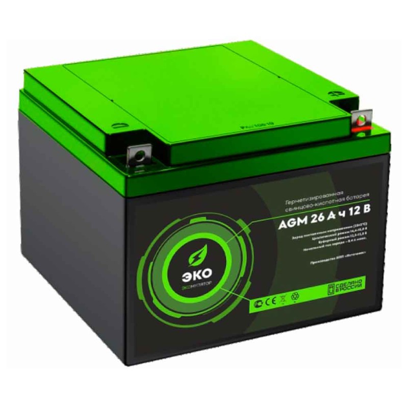 **Аккумулятор ЭКО 12-26 (12V / 26Ah)**Свинцово-кислотный аккумулятор ЭКО 12-26 напряжением 12 В и ёмкостью 26 Ач и обладает целым рядом особенностей. Благодаря пластинам из свинца высокой очистки и специальной форме стекловолоконных сепараторов срок службы батареи на 20% выше, чем у аналогов — 10-12 лет в буферном режиме или 600 циклов. Корпус AGM аккумулятора ЭКО 12-26 выполнен из ударопрочного пластика и надёжно герметизирован: АКБ не требует обслуживания на протяжении всего срока эксплуатации и может работать в любом положении, а также устойчив к воздействию вибрации и температур. Аккумуляторы этой линейки на 99% состоят из перерабатываемых материалов — в отличи от других кислотных батарей ЭКО 12-26 чистый и экологичный. Они производятся в России, городе Тихвин. Технические характеристики АКБ ЭКО 12-26 Номинальное напряжение 12 В Число элементов 6 Максимальный разрядный ток (25 °С) 420 А (5 с) Внутреннее сопротивление полностью заряженной батареи (25 °С) 12 мОм Саморазряд (при 20 °С) менее 3% в месяц Срок службы в буферном режиме 10 лет Номинальная емкость (25 °С) 20 часовой разряд 27.1 Ач 10 часовой разряд 26 Ач 5 часовой разряд 18.2 Ач Циклический режим (2,3–2,35 В) Максимальный зарядный ток 7.8 А Заряд постоянным напряжением 14.7-15 В (-24 мВ/°С) Буферный режим (2,23–2,27 В) Заряд постоянным напряжением 13.6-13.8 В (-18 мВ/°С) Влияние температуры на ёмкость (20 ч заряд) 40 °С 107% 25 °С 100% 0 °С 76% -20 °С 46% Особенности аккумулятора ЭКО 12-26 Свинцово-кислотный AGM аккумулятор До 10-12 лет эксплуатации 600 циклов заряд-разряд На 99% из перерабатываемых материалов Производится в России Работает в любом положении Применение аккумулятора ЭКО 12-26 Источники бесперебойного питания Пожарные и охранные системы Медицинское оборудование Аварийное оповещение Телекоммуникации и связь Транспортная автоматика Разряд постоянным током, А (при 25 °С) АКБ ЭКО 12-26 Конечное напряжение, В/эл. 15 мин 30 мин 1 ч 2 ч 3 ч 5 ч 8 ч 10 ч 20 ч 9.6В 53.9 28.7 18.2 10.25 7.322 4.939 3.27 2.8 1.498 10.2В 50.82 27.86 17.79 10.09 7.14 4.866 3.22 2.73 1.445 10.5В 49.02 27.02 17.57 10.01 7.07 4.83 3.192 2.702 1.414 10.8В 45.22 26.18 17.32 9.926 6.986 4.774 3.15 2.6 1.358 Разряд постоянной мощностью, Вт (при 25°С) АКБ ЭКО 12-26 Конечное напряжение, В/эл. 15 мин 30 мин 1 ч 2 ч 3 ч 5 ч 8 ч 10 ч 20 ч 9.6В 595.62 328.62 216.6 122.04 87.6 59.124 39.144 33.546 17.976 10.2В 571.74 321.78 212.64 120.6 85.56 58.302 38.574 32.76 17.364 10.5В 545.04 314.76 210.12 119.7 84.78 57.912 38.274 32.454 17.04 10.8В 517.74 307.62 207.3 118.8 83.82 57.288 37.8 31.944 16.362Характеристики:- Характеристики:Напряжение, В:12- Характеристики:Емкость, Ач:26- Характеристики:Технология:AGM- Характеристики:Срок службы АКБ, лет:10- Характеристики:Тип клеммы:Ушко под болт+гайка M6- Характеристики:Тип аккумулятора:Стационарный- Характеристики:Длина, мм.:167- Характеристики:Ширина, мм.:176Преимущества:- Надёжность и качество от производителя- Категория: Аккумуляторные батареи|Аккумуляторные батареи>ЭКОДоставка по Казахстану. Гарантия и сервисное обслуживание.Нужна консультация — наши специалисты помогут подобрать оптимальную модель.
