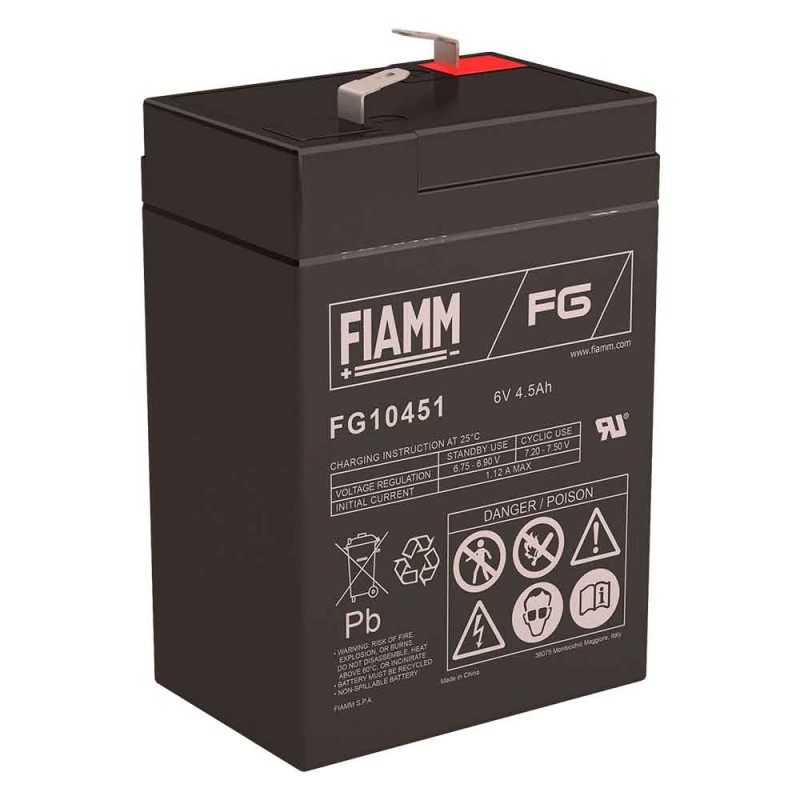 **Аккумулятор FIAMM FG10451 (6V / 4.5Ah)**Свинцово-кислотный аккумулятор FIAMM FG 10451 (ёмкость 4.5 Ач, напряжение 6 В) подходит как для быстрых разрядов высокими токами, так и для длительных средними и малыми токами. Корпус — герметичный моноблок из ударопрочного ABS-пластика, на крышке которого располагается односторонний клапан избыточного давления со встроенным пламегасителем. Жидкий электролит (раствор серной кислоты) удерживается неподвижно мелкопористыми стекловолоконными сепараторами. Срок службы FIAMM FG10451 при правильной эксплуатации составляет 5 лет. Батарея обладает низким саморазрядом и газовыделением, может использоваться в буферном и циклическом режимах. Более подробную информацию можно получить в разделе « Документы ». Дата производства аккумулятора FIAMM FG 10451 указана на крышке в виде символьного кода. Технические характеристики АКБ FIAMM FG10451 Номинальное напряжение 6 В Число элементов 3 Максимальный разрядный ток (25 °С) 45 А Внутреннее сопротивление полностью заряженной батареи (25 °С) - мОм Саморазряд (при 20 °С) 2% в месяц Срок службы в буферном режиме 5 лет Номинальная емкость (25 °С) 20 часовой разряд (- А, 1.8 В/эл.) - Ач 10 часовой разряд (- А, 1.8 В/эл.) - Ач 5 часовой разряд (- А, 1.75 В/эл.) - Ач Циклический режим (– В) Максимальный зарядный ток 1.13 А Температурная компенсация - мВ/°С Буферный режим (– В) Температурная компенсация - мВ/°С Диапазон рабочих температур Оптимальная рабочая температура +20 °С Разряд -15 °С ~ 50 °С Заряд 0 °С ~ 40 °С Хранение -15 °С ~ 40 °С Конструкция аккумулятора FIAMM FG 10451 Компонент Материал Положительная пластина Диоксид свинца Отрицательная пластина Свинец Корпус и крышка Синтетическая смола ABS Клапан предохранительный Каучук Клеммы Медь Сепаратор Стекловолокно Электролит Серная кислота Особенности аккумулятора FIAMM FG10451 Технология AGM Ударопрочный корпус из ABS-пластика Срок службы — 5 лет Применение аккумулятора FIAMM FG 10451 ИБП Телеком Системы безопасности Общие сведения Свинцово-кислотный аккумулятор FIAMM FG10451 создан с использованием технологии AGM — жидкий электролит удерживается неподвижно в мелкопористых стекловолоконных сепараторах. Корпус представляет из себя моноблок из усиленного ABS-пластика, он полностью герметичен, что позволяет обеспечить рекомбинацию газов. На крышке для каждого элемента предусмотрен односторонний клапан избыточного давления, он срабатывает при достижении 30 кПа, также в нём предусмотрен встроенный пламегаситель. FIAMM FG 10451 необслуживаемый, на протяжении всего срока службы доливать воду не требуется, вскрывать аккумулятор и клапан запрещено, это приведёт к разрушению батареи. Срок службы при нормальной эксплуатации достигает 5 лет. FIAMM FG10451 предназначен как для быстрых разрядов высокими токами, так и средними/низкими длительное время (циклический и буферные режимы). Транспортировка При соблюдении всех правил и рекомендаций FIAMM FG 10451 абсолютно безопасен при использовании и перевозке. Перед транспортировкой необходимо произвести визуальный осмотр оборудования на наличие коррозии, следов протечки электролита и механических повреждений, если таковые имеются, то аккумулятор перевозится как опасный груз класса 8. Необходимо предусмотреть защиту изделий от тряски (амортизирующие подкладки), падения/опрокидывания, короткого замыкания (клеммы должны быть снабжены специальными защитными колпачками), во