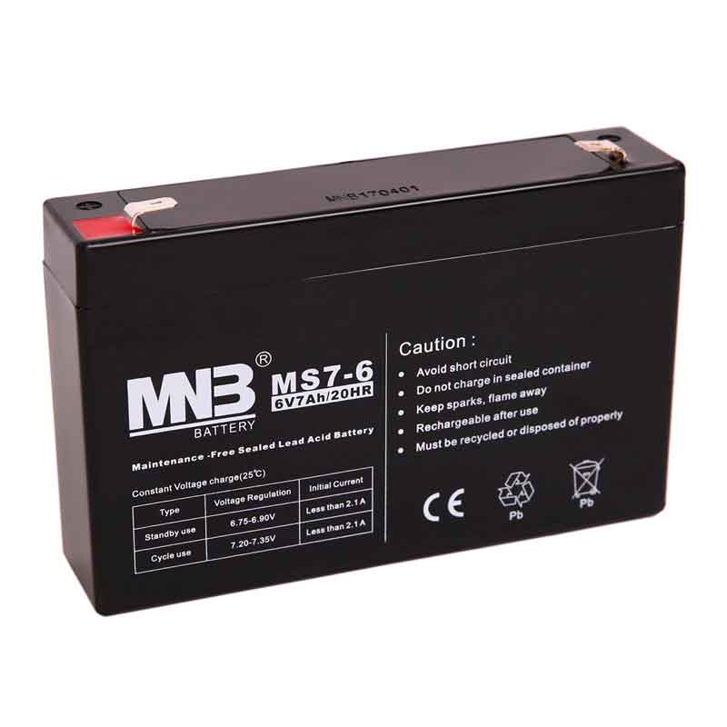 **Аккумулятор MNB MS 7-6 (6V / 7Ah)**Свинцово-кислотный аккумулятор MNB MS 7-6 (ёмкость 7.2 Ач, напряжение 6 В) производится по технологии AGM — стекловолоконные сепараторы, пропитанные жидким электролитом. Батарея не требует обслуживания на протяжении всего срока службы: внутри аккумулятора поддерживается давление, обеспечивающее рекомбинацию газов. На крышке располагается односторонний VRLA-клапан, сбрасывающий избыточное давление. Срок службы в буферном режиме 5 лет, в циклическом 260 циклов при 100% глубине разряда и 500 при 50%. Дата производства аккумулятора MNB MS 7-6 указана на крышке в виде символьного кода. Технические характеристики АКБ MNB MS 7-6 Номинальное напряжение 6 В Число элементов 3 Максимальный разрядный ток (25 °С) 68 А (5 с) Внутреннее сопротивление полностью заряженной батареи (25 °С) 16 мОм Саморазряд (при 20 °С) 3% в месяц Срок службы в буферном режиме 5 лет Номинальная емкость (25 °С) 20 часовой разряд (- А, 10.5 В/эл.) 7 Ач 10 часовой разряд (- А, 10.5 В/эл.) 6.5 Ач 1 часовой разряд (- А, 9.6 В/эл.) 4.2 Ач Циклический режим (14.5–14.9 В) Максимальный зарядный ток 2.1 А Температурная компенсация - 30 мВ/°С Буферный режим (13.6–13.8 В) Температурная компенсация - 20 мВ/°С Диапазон рабочих температур Оптимальная рабочая температура +20 °С Разряд -20 °С ~ 60 °С Заряд -10 °С ~ 60 °С Хранение -20 °С ~ 60 °С Конструкция аккумулятора MNB MS 7-6 Компонент Материал Положительная пластина Диоксид свинца Отрицательная пластина Свинец Корпус и крышка Синтетическая смола ABS Клапан предохранительный Каучук Клеммы Медь Сепаратор Стекловолокно Электролит Серная кислота Особенности аккумулятора MNB MS 7-6 Герметизированная конструкция Система внутренней рекомбинации газов с эффективностью 99% Дополнительное обслуживание (долив воды) не требуется Наличие регулирующих внутреннее давление клапанов (VRLA) Низкий саморазряд Применение аккумулятора MNB MS 7-6 Источники бесперебойного питания Системы связи Телекоммуникации Альтернативная энергетика Автономные системы электроснабжения Разряд постоянным током, А (при 25 °С) АКБ MNB MS 7-6 Конечное напряжение, В 5 мин 10 мин 15 мин 30 мин 1 ч 2 ч 3 ч 4 ч 5 ч 9.6 26.7 16.9 13.2 7.46 4.59 2.51 1.74 1.44 1.22 9.9 25.9 16.4 12.9 7.31 4.52 2.49 1.72 1.43 1.21 10.2 24.9 15.8 12.4 7.08 4.4 2.47 1.71 1.42 1.21 10.5 23.8 15.1 12 6.91 4.31 2.43 1.7 1.41 1.2 10.8 22.5 14.2 11.4 6.66 4.18 2.37 1.65 1.36 1.16 Разряд постоянной мощностью, Вт (при 25°С) АКБ MNB MS 7-6 Конечное напряжение, В 5 мин 10 мин 15 мин 30 мин 1 ч 2 ч 3 ч 4 ч 5 ч 9.6 149 95.5 75.4 42.7 26.5 2.51 10.3 8.55 7.29 9.9 145 92.7 73.6 41.9 26.1 2.49 10.2 8.5 7.25 10.2 139 88.9 70.9 40.6 25.5 2.47 10.2 8.44 7.2 10.6 133 85 68.5 39.6 25 2.43 10.1 8.38 7.15 10.8 125 80.3 64.9 38.1 24.2 2.37 9.8 8.13 6.93 Транспортировка Свинцово-кислотный аккумулятор MNB MS 7-6 полностью безопасен при перевозках. Ударопрочный корпус обеспечивает герметичность и защиту, на крышке располагается односторонний клапан избыточного давления, это полностью исключает возможность протечки электролита. Допускается перевозка морским, автомобильным, железнодорожным и воздушным транспортом. Перед отправкой проверьте аккумуляторы на наличие механических повреждений и следов протечки электролита — повреждённые батареи перевозятся как опасный груз класса 8. Эксплуатация Перед началом эксплуатации внимательно изучите инструкцию, а затем полностью зарядите MNB MS 7-6. Благодаря герметичному корпусу батарея может использоваться как в вертикальном, так и в горизонтальном положении. Для обеспечения корректной работы клапана избыточного давления не устанавливайте аккумулятор на крышку. Важную ро