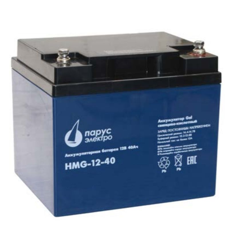 **Аккумулятор Парус Электро HMG-12-40 (12V / 40Ah)**Свинцово-кислотный аккумулятор Парус электро HMG-12-40 (ёмкость 40 Ач, напряжение 12 В) обладает повышенной устойчивостью к низким температурам и глубоким разрядам, это достигается благодаря загущенному силикагелю (желеобразный электролит). Батарея выдерживает большее количество циклов заряда-разряда, чем обычные аккумуляторы. Корпус Парус электро HMG-12-40 полностью герметичен, рекомбинация газов происходит внутри батареи, а значит её обслуживание на протяжении всего срока службы (12 лет) не требуется. Аккумулятор может использоваться в циклическом и буферном режиме для систем источников возобновляемой энергии, промышленности и других ответственных узлах.Более подробную информацию можно получить в разделе «Документы». Дата производства аккумулятора Парус электро HMG-12-40 указана на крышке в виде символьного кода. Технические характеристики АКБ Парус электро HMG-12-40 Номинальное напряжение 12 В Число элементов 6 Максимальный разрядный ток (25 °С) 400 А (5 с) Внутреннее сопротивление полностью заряженной батареи (25 °С) 9.5 мОм Саморазряд (при 20 °С) 3% в месяц Срок службы в буферном режиме 12 лет Номинальная емкость (25 °С) 20 часовой разряд (2 А, 10.5 В/эл.) 40 Ач 10 часовой разряд (3.66 А, 10.5 В/эл.) 36.6 Ач 1 часовой разряд (25.3 А, 9.6 В/эл.) 25.3 Ач Циклический режим (2.4 – 2.45 В) Максимальный зарядный ток 12 А Температурная компенсация 30 мВ/°С Буферный режим (2.23 – 2.3 В) Температурная компенсация 20 мВ/°С Диапазон рабочих температур Оптимальная рабочая температура +25 °С Разряд -20 °С ~ 60 °С Заряд -10 °С ~ 60 °С Хранение -20 °С ~ 60 °С Конструкция аккумулятора Парус электро HMG-12-40 Компонент Материал Положительная пластина Диоксид свинца Отрицательная пластина Свинец Корпус и крышка Синтетическая смола ABS Клапан предохранительный Каучук Клеммы Медь Сепаратор Стекловолокно Электролит Серная кислота Особенности аккумулятора Парус электро HMG-12-40 Технология AGM Не требует обслуживания Срок службы — 12 лет Допускается перевозка любым транспортом Применение аккумулятора Парус электро HMG-12-40 ИБП Видеонаблюдение и охранно-пожарные системы Медицинское оборудование Аварийное освещение и фонари Разряд постоянным током, А (при 25 °С) АКБ Парус электро HMG-12-40 Конечное напряжение, В/эл. 5 мин 10 мин 15 мин 30 мин 1 ч 3 ч 5 ч 1.60 131 89 72.4 40.7 25.3 10.4 7.3 1.65 124 85 69.1 39.1 24.4 10.1 7.2 1.70 117 81 65.7 37.4 23.5 9.7 6.9 1.75 110 76 62.4 35.6 22.3 9.4 6.7 1.80 104 72 58.9 33.7 21.3 8.9 6.5 Разряд постоянной мощностью, Вт (при 25°С) АКБ HMG-12-40 Конечное напряжение, В/эл. 5 мин 10 мин 15 мин 30 мин 45 мин 1 ч 2 ч 1.60 238 163 133 76 60.5 50.7 28.6 1.65 226 156 128 73 58.6 49.2 27.8 1.70 215 149 123 70 56.6 47.7 26.9 1.75 203 142 117 67 54.3 45.7 26 1.80 191 133 111 64 51.7 43.6 24.8 Транспортировка Аккумулятор Парус электро HMG-12-40 подходит для любых перевозок, ограничения отсутствуют, ведь корпус полностью герметичен, а электролит удерживается стекловолоконными сепараторами. Батареи с повреждениями корпуса и следами протечки кислоты упаковываются и перевозятся как опасный груз класса 8. при соблюдении всех правил и рекомендаций HMG-12-40 является полностью безопасным при транспортировке. Перевозите аккумуляторы в вертикальном положении и не укладывайте ничего поверх них или рядом. Используйте специальные защитные колпачки для клемм — они всегда находятся под напряжением. Не допускайте падения, опрокидывания и нагрева аккумуляторов. Эксплуатация Перед началом использования внимательно изучите инструкцию от изготовителя и