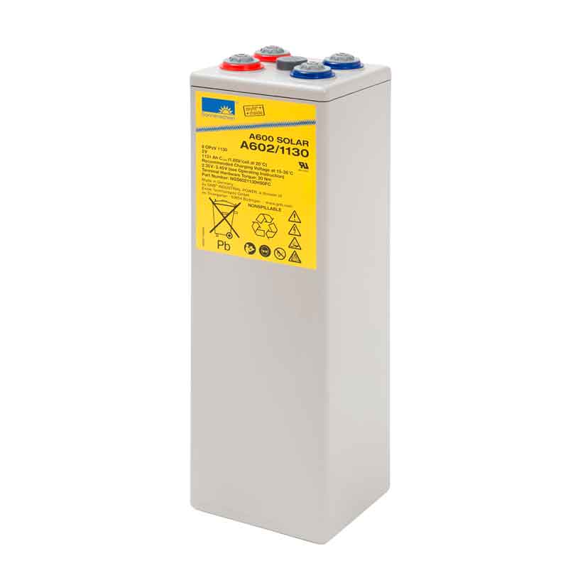 **Аккумулятор Sonnenschein A602/1130 SOLAR (2V / 1126Ah)**Свинцово-кислотный аккумулятор Sonnenschein A602/1130 SOLAR (ёмкость 1126 Ач, напряжение 2 В) разработан для преобразования солнечной энергии, он также используется для небольших систем автономного электроснабжения, телекоммуникациях, источниках бесперебойного питания, нефтегазовой промышленности. Циклический ресурс составляет 800 циклов заряд-разряд. Корпус выполнен из прочного ABS-пластика и надёжно герметизирован. Внутри Sonnenschein A602/1130 SOLAR поддерживается давление, необходимое для рекомбинации газов, благодаря этому обслуживание батареи не требуется. Электролит находится в желеобразном состоянии (технология Dryfit), это повышает устойчивость аккумулятора к воздействию температур и глубоких разрядов. Дата производства аккумулятора Sonnenschein A602/1130 SOLAR указана на крышке в виде символьного кода. Технические характеристики АКБ Sonnenschein A602/1130 SOLAR Номинальное напряжение 2 В Число элементов 1 Максимальный разрядный ток (25 °С) - А (5 с) Внутреннее сопротивление полностью заряженной батареи (25 °С) - мОм Саморазряд (при 20 °С) 3% в месяц Срок службы в циклическом режиме 800 циклов Циклический режим (2,42 В) Максимальный зарядный ток - А Температурная компенсация - мВ/эл°С Буферный режим (2,275 В) Температурная компенсация - мВ/эл°С Диапазон рабочих температур Оптимальная рабочая температура +20–25 °С Разряд -20 °С ~ 40 °С Заряд -20 °С ~ 40 °С Хранение -20 °С ~ 40 °С Конструкция аккумулятора Sonnenschein A602/1130 SOLAR Компонент Материал Положительная пластина Диоксид свинца Отрицательная пластина Свинец Корпус и крышка Синтетическая смола ABS Клапан предохранительный Каучук Клеммы Медь Сепаратор Стекловолокно Электролит Серная кислота Особенности аккумулятора Sonnenschein A602/1130 SOLAR Низкий саморазряд — менее 3% в месяц Технология Dryfit — желеобразный электролит Прочный корпус с клапаном избыточного давления Работа в циклическом и буферном режимах Область применения аккумулятора Sonnenschein A602/1130 SOLAR ИБП Телекоммуникации Нефть и газ Охранные системы Общее описание Свинцово-кислотный аккумулятор Sonnenschein A602/1130 SOLAR производится в Европе и обладает повышенными разрядными характеристиками. Его корпус изготовлен таким образом, чтобы обеспечить максимальную энергоёмкость при минимальной площади основания. Удобные габариты позволяют использовать меньше соединительных кабелей, за счёт чего сильно упрощается и удешевляется обслуживание таких батарей. Отличительной особенностью данного аккумулятора является использование технологии dryfit — электролит загущен до состояния геля, это повышает его устойчивость к глубоким разрядам и перепадам температур. Sonnenschein A602/1130 SOLAR предназначен для работы в буферном режиме, но его можно эксплуатировать и в циклическом. Высокие разрядные токи и большая плотность энергии делают этот аккумулятор отличным решением для ИБП и других ответственных систем. Корпус из полипропилена полностью герметичен, разлив электролита без повреждений аккумулятора невозможен, а его обслуживание не требуется на протяжении всего срока службы. На крышке располагается клапан избыточного давления, он предназначен для выбросов избытка газов в атмосферу. Внутри аккумулятора поддерживается давление на 0,15 бар выше атмосферного, из-за этого стенки батареи могут быть немного вспучены (до 4 мм), это не является признаком неисправности изделия. Ни при каки