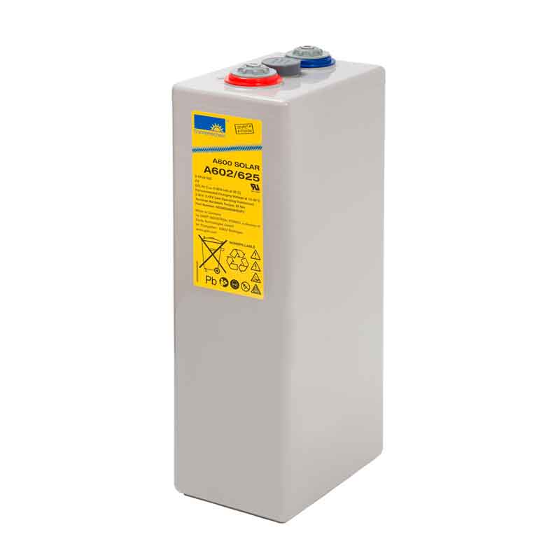 **Аккумулятор Sonnenschein A602/625 SOLAR (2V / 623Ah)**Свинцово-кислотный аккумулятор Sonnenschein A602/625 SOLAR (ёмкость 623 Ач, напряжение 2 В) разработан для преобразования солнечной энергии, он также используется для небольших систем автономного электроснабжения, телекоммуникациях, источниках бесперебойного питания, нефтегазовой промышленности. Циклический ресурс составляет 800 циклов заряд-разряд. Корпус выполнен из прочного ABS-пластика и надёжно герметизирован. Внутри Sonnenschein A602/625 SOLAR поддерживается давление, необходимое для рекомбинации газов, благодаря этому обслуживание батареи не требуется. Электролит находится в желеобразном состоянии (технология Dryfit), это повышает устойчивость аккумулятора к воздействию температур и глубоких разрядов. Дата производства аккумулятора Sonnenschein A602/625 SOLAR указана на крышке в виде символьного кода. Технические характеристики АКБ Sonnenschein A602/625 SOLAR Номинальное напряжение 2 В Число элементов 1 Максимальный разрядный ток (25 °С) - А (5 с) Внутреннее сопротивление полностью заряженной батареи (25 °С) - мОм Саморазряд (при 20 °С) 3% в месяц Срок службы в циклическом режиме 800 циклов Циклический режим (2,42 В) Максимальный зарядный ток - А Температурная компенсация - мВ/эл°С Буферный режим (2,275 В) Температурная компенсация - мВ/эл°С Диапазон рабочих температур Оптимальная рабочая температура +20–25 °С Разряд -20 °С ~ 40 °С Заряд -20 °С ~ 40 °С Хранение -20 °С ~ 40 °С Конструкция аккумулятора Sonnenschein A602/625 SOLAR Компонент Материал Положительная пластина Диоксид свинца Отрицательная пластина Свинец Корпус и крышка Синтетическая смола ABS Клапан предохранительный Каучук Клеммы Медь Сепаратор Стекловолокно Электролит Серная кислота Особенности аккумулятора Sonnenschein A602/625 SOLAR Низкий саморазряд — менее 3% в месяц Технология Dryfit — желеобразный электролит Прочный корпус с клапаном избыточного давления Работа в циклическом и буферном режимах Область применения аккумулятора Sonnenschein A602/625 SOLAR ИБП Телекоммуникации Нефть и газ Охранные системы Общее описание Свинцово-кислотный аккумулятор Sonnenschein A602/625 SOLAR производится в Европе и обладает повышенными разрядными характеристиками. Его корпус изготовлен таким образом, чтобы обеспечить максимальную энергоёмкость при минимальной площади основания. Удобные габариты позволяют использовать меньше соединительных кабелей, за счёт чего сильно упрощается и удешевляется обслуживание таких батарей. Отличительной особенностью данного аккумулятора является использование технологии dryfit — электролит загущен до состояния геля, это повышает его устойчивость к глубоким разрядам и перепадам температур. Sonnenschein A602/625 SOLAR предназначен для работы в буферном режиме, но его можно эксплуатировать и в циклическом. Высокие разрядные токи и большая плотность энергии делают этот аккумулятор отличным решением для ИБП и других ответственных систем. Корпус из полипропилена полностью герметичен, разлив электролита без повреждений аккумулятора невозможен, а его обслуживание не требуется на протяжении всего срока службы. На крышке располагается клапан избыточного давления, он предназначен для выбросов избытка газов в атмосферу. Внутри аккумулятора поддерживается давление на 0,15 бар выше атмосферного, из-за этого стенки батареи могут быть немного вспучены (до 4 мм), это не является признаком неисправности изделия. Ни при каких обст