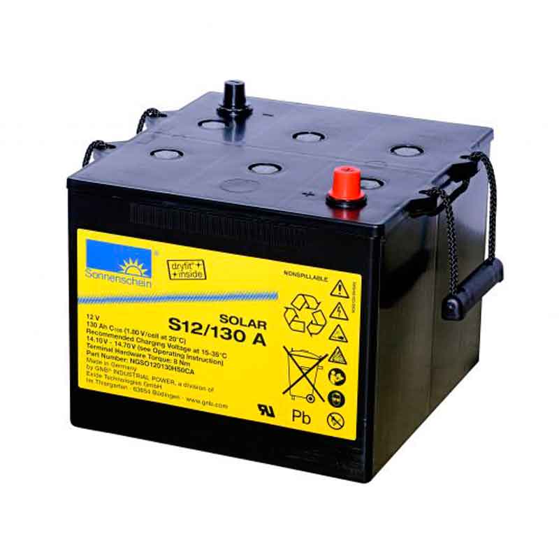 **Аккумулятор Sonnenschein S 12/130 A (12V / 130Ah)**Свинцово-кислотный аккумулятор Sonnenschein Solar S 12/130 A (ёмкость 130 Ач, напряжение 12 В) разработан для преобразования солнечной энергии, он также используется для небольших систем автономного электроснабжения, телекоммуникациях, источниках бесперебойного питания, нефтегазовой промышленности. Циклический ресурс составляет 800 циклов заряд-разряд. Корпус выполнен из прочного ABS-пластика и надёжно герметизирован. Внутри Sonnenschein Solar S 12/130 A поддерживается давление, необходимое для рекомбинации газов, благодаря этому обслуживание батареи не требуется. Электролит находится в желеобразном состоянии (технология Dryfit), это повышает устойчивость аккумулятора к воздействию температур и глубоких разрядов. Дата производства аккумулятора Sonnenschein Solar S 12/130 A указана на крышке в виде символьного кода. Технические характеристики АКБ Sonnenschein Solar S 12/130 A Номинальное напряжение 12 В Число элементов 6 Максимальный разрядный ток (25 °С) - А (5 с) Внутреннее сопротивление полностью заряженной батареи (25 °С) - мОм Саморазряд (при 20 °С) 3% в месяц Срок службы в циклическом режиме 800 циклов Циклический режим (2,42 В) Максимальный зарядный ток - А Температурная компенсация - мВ/эл°С Буферный режим (2,275 В) Температурная компенсация - мВ/эл°С Диапазон рабочих температур Оптимальная рабочая температура +20–25 °С Разряд -20 °С ~ 40 °С Заряд -20 °С ~ 40 °С Хранение -20 °С ~ 40 °С Конструкция аккумулятора Sonnenschein Solar S 12/130 A Компонент Материал Положительная пластина Диоксид свинца Отрицательная пластина Свинец Корпус и крышка Синтетическая смола ABS Клапан предохранительный Каучук Клеммы Медь Сепаратор Стекловолокно Электролит Серная кислота Особенности аккумулятора Sonnenschein Solar S 12/130 A Низкий саморазряд — менее 3% в месяц Технология Dryfit — желеобразный электролит Прочный корпус с клапаном избыточного давления Работа в циклическом и буферном режимах Область применения аккумулятора Sonnenschein Solar S 12/130 A ИБП Телекоммуникации Нефть и газ Охранные системы Общее описание Свинцово-кислотный аккумулятор Sonnenschein Solar S 12/130 Aпроизводится в Европе и обладает повышенными разрядными характеристиками. Его корпус изготовлен таким образом, чтобы обеспечить максимальную энергоёмкость при минимальной площади основания. Удобные габариты позволяют использовать меньше соединительных кабелей, за счёт чего сильно упрощается и удешевляется обслуживание таких батарей. Отличительной особенностью данного аккумулятора является использование технологии dryfit — электролит загущен до состояния геля, это повышает его устойчивость к глубоким разрядам и перепадам температур. Sonnenschein Solar S 12/130 A предназначен для работы в буферном режиме, но его можно эксплуатировать и в циклическом. Высокие разрядные токи и большая плотность энергии делают этот аккумулятор отличным решением для ИБП и других ответственных систем. Корпус из полипропилена полностью герметичен, разлив электролита без повреждений аккумулятора невозможен, а его обслуживание не требуется на протяжении всего срока службы. На крышке располагается клапан избыточного давления, он предназначен для выбросов избытка газов в атмосферу. Внутри аккумулятора поддерживается давление на 0,15 бар выше атмосферного, из-за этого стенки батареи могут быть немного вспучены (до 4 мм), это не является признаком неисправности изделия. Ни при ка