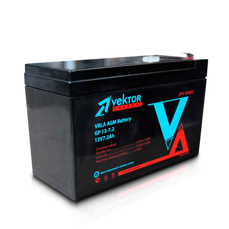 **Аккумулятор Vektor GP 12-7,2 (12V / 7.2Ah)**Свинцово-кислотный аккумулятор Vektor GP 12-7,2 (напряжение 12 В, ёмкость 7.2 Ач) производится по технологии AGM — жидкий электролит удерживается внутри герметичного корпуса стекловолоконными сепараторами. Это повышает количество циклов заряд-разряд, исключает возможность вытекания кислоты и повышает устойчивость к температурным воздействиям. Аккумулятор Vektor GP 12-7,2 подходит для ИБП, телекоммуникаций, медицинского оборудования, систем охраны и пожаробезопасности. Низкий уровень саморазряда (менее 3% в месяц) позволяет хранить батарею без подзарядки 6 месяцев. Vektor GP 12-7,2 подходит для использования в циклическом и буферном режиме. Дата производства аккумулятора Vektor GP 12-7,2 указана на крышке в виде символьного кода. Технические характеристики АКБ Vektor GP 12-7,2 Номинальное напряжение 12 В Число элементов 6 Максимальный разрядный ток (25 °С) 108 А (5 с) Внутреннее сопротивление полностью заряженной батареи (25 °С) 21 мОм Саморазряд (при 20 °С) 3% в месяц Срок службы в буферном режиме 5 лет Номинальная емкость (25 °С) 20 часовой разряд (10.5 В) 7.2 Ач 10 часовой разряд (10.5 В) 6.7 Ач 1 часовой разряд (9.6 В) 4.7 Ач Циклический режим Максимальный зарядный ток 2.16 А Температурная компенсация - Буферный режим Температурная компенсация - Диапазон рабочих температур Оптимальная рабочая температура +25 °С Разряд -20 °С ~ 60 °С Заряд -10 °С ~ 60 °С Хранение -20 °С ~ 60 °С Конструкция аккумулятора Vektor GP 12-7,2 Компонент Материал Положительная пластина Диоксид свинца Отрицательная пластина Свинец Корпус и крышка Синтетическая смола ABS Клапан предохранительный Каучук Клеммы Медь Сепаратор Стекловолокно Электролит Серная кислота Особенности аккумулятора Vektor GP 12-7,2 Технология AGM Высокая плотность энергии Дополнительное обслуживание (долив воды) не требуется Наличие регулирующих внутреннее давление клапанов (VRLA) Низкий саморазряд Срок службы 5 лет Применение аккумулятора Vektor GP 12-7,2 Источники бесперебойного питания Энергетика Телеком ЦОД Медицина Разряд постоянным током, А (при 25 °С) АКБ Vektor GP 12-7,2 Конечное напряжение, В/эл. 5 мин 10 мин 15 мин 30 мин 1 ч 2 ч 3 ч 4 ч 5 ч 10 ч 20 ч 9.6 28.7 18.2 14.2 7.99 4.74 2.69 1.86 1.54 1.31 0.7 0.37 9.9 27.8 17.6 13.8 7.83 4.72 2.67 1.85 1.53 1.3 0.69 0.37 10.2 26.6 16.9 13.3 7.59 4.71 2.65 1.84 1.52 1.29 0.68 0.36 10.5 25.5 16.2 12.9 7.4 4.69 2.61 1.82 1.51 1.28 0.67 0.36 10.8 24.1 15.2 12.2 7.13 4.67 2.54 1.77 1.46 1.24 0.66 0.35 Разряд постоянной мощностью, Вт (при 25°С) АКБ Vektor GP 12-7,2 Конечное напряжение, В/эл. 5 мин 10 мин 15 мин 30 мин 1 ч 2 ч 3 ч 4 ч 5 ч 10 ч 20 ч 9.6 320 205 162 91.5 56.9 31.4 22.1 18.3 15.6 8.52 4.57 9.9 310 199 158 89.7 56 31.3 22 18.2 15.5 8.49 4.55 10.2 297 190 152 87 54.6 31 21.8 18.1 15.4 8.45 4.53 10.5 285 182 147 84.9 53.5 30.5 21.7 18 15.3 8.4 4.5 10.8 269 172 139 81.7 51.9 29.7 21 17.4 14.9 8.23 4.41 Транспортировка При соблюдении всех правил и рекомендаций производителя аккумуляторы Vektor GP 12-7,2 полностью безопасны. Их можно перевозить любым видом транспорта: воздушный, морской, речной, автомобильный и железнодорожный. Перед отправкой обязательно проверьте целостность каждого изделия, на батареях не должно быть сколов, трещин, следов протечки электролита и других дефектов. Повреждённые аккумуляторы до эксплуатации не допускаются и должны быть утилизированы. На время транспортировки батареи Vektor GP 12-7,2 укладываются вертикально клапаном вверх в один ряд на паллеты. Клеммы должны быть защищены специальными колпачками. Не кладите ничего поверх аккумуляторов, не допускайте их падения и опрокидывания. Во время транспортировки должен поддерживаться температурный режим в районе +20
