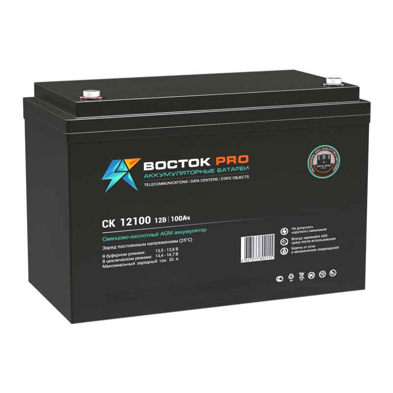 **Аккумулятор Восток СК-12100 (12V / 100Ah)**Свинцово-кислотный аккумулятор Восток СК-12100 (ёмкость 100 Ач, напряжение 12 В) обладает высокими разрядными и эксплуатационными характеристиками. Высокое качество батарей позволяет использовать их в ИБП, системах отопления/водоснабжения, резервных системах энергоснабжения. Полностью герметичный корпус из ABS-пластика позволяет газам рекомбинировать внутри аккумулятора, это делает Восток СК12100 необслуживаемым — доливать воду не требуется. Срок службы батареи в циклическом режиме при правильной эксплуатации достигает 1200 циклов, в буферном — 5 лет. Более подробную информацию можно получить в разделе « Документы ». Дата производства аккумулятора Восток СК-12100 указана на крышке в виде символьного кода. Технические характеристики АКБ Восток СК12100 Номинальное напряжение 12 В Число элементов 6 Максимальный разрядный ток (25 °С) 900 А Внутреннее сопротивление полностью заряженной батареи (25 °С) 5 мОм Саморазряд (при 20 °С) 3% в месяц Срок службы в буферном режиме 5 лет Номинальная емкость (25 °С) 20 часовой разряд (5 А, 1.75 В/эл.) 100 Ач 10 часовой разряд (9.6 А, 1.75 В/эл.) 96 Ач 5 часовой разряд (17.2 А, 1.70 В/эл.) 86 Ач Циклический режим (2,4–2,45 В) Максимальный зарядный ток 30 А Температурная компенсация 5 мВ/°С Буферный режим (2,25–2,3 В) Температурная компенсация 3.3 мВ/°С Диапазон рабочих температур Оптимальная рабочая температура +25 °С Разряд -20 °С ~ 60 °С Заряд -10 °С ~ 60 °С Хранение -20 °С ~ 60 °С Конструкция аккумулятора Восток СК-12100 Компонент Материал Положительная пластина Диоксид свинца Отрицательная пластина Свинец Корпус и крышка Синтетическая смола ABS Клапан предохранительный Каучук Клеммы Медь Сепаратор Стекловолокно Электролит Серная кислота Особенности аккумулятора Восток СК12100 Технология AGM — рекомбинация газов внутри герметичного корпуса Компактные размеры Высокая надёжность — расзработаны для ответственных узлов Применение аккумулятора Восток СК-12100 ИБП Телеком Альтернативная энергетика Разряд постоянным током, А (при 25 °С) АКБ Восток СК12100 Конечное напряжение, В/эл. 5 мин 10 мин 15 мин 30 мин 1 ч 3 ч 5 ч 10 ч 20 ч 1.60 294 209 172 99.9 58.5 26 17.4 9.89 5.28 1.65 279 201 164 97.8 58.2 25.9 17.3 9.78 5.19 1.70 247 180 148 89.3 57.7 25.7 17.2 9.69 5.09 1.75 230 168 139 86.9 57.2 25.6 17 9.6 5 1.80 213 159 134 85.1 54.3 23.9 16.4 9.51 4.9 Разряд постоянной мощностью, Вт (при 25°С) АКБ Восток СК-12100 Конечное напряжение, В/эл. 5 мин 10 мин 15 мин 30 мин 1 ч 3 ч 5 ч 10 ч 20 ч 1.60 530 381 315 189 113 49.1 34.5 19.7 10.2 1.65 511 378 310 182 108 48.9 33.9 19.5 10.2 1.70 472 349 293 168 103 48.6 33.2 19.3 10.1 1.75 448 335 277 164 101 46.5 32.8 19.1 9.99 1.80 425 317 267 161 99.8 45.4 32 19 9.7 Транспортировка Аккумулятор Восток СК12100 полностью безопасен для любых перевозок. Допускается транспортировка воздушным, морским, автомобильным и железнодорожным транспортом. Необходимо убедиться, что на корпусе отсутствуют трещины, механические повреждения и протечки электролита. Аккумуляторы с повреждениями перевозятся как опасный груз класса 8. Транспортировать батареи допускается, уложив их в один ряд на паллеты, класть что-либо сверху категорически запрещено. Не допускайте нагрева аккумуляторов, из падения или опрокидывания, поддерживайте температуру на уровне + 25 °С. На клеммах должны быть предусмотрены специальные защитные колпачки. Эксплуатация Перед началом использования Восток СК-12100 ознакомьтесь с инструкцией от производителя и полностью зарядите аккумулятор (см. раздел «Заряд»). Батареи с повреждениями корпуса и протекающим электролито