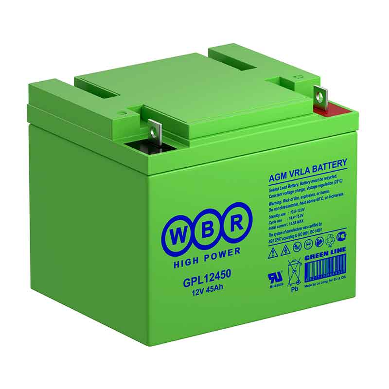 **Аккумулятор WBR GPL12450 (12V / 45Ah)**Свинцово-кислотный аккумулятор WBR GPL 12450 ёмкостью 45 Ач, напряжением 12 В может использоваться как в циклическом, так и в буферном режиме. Главной особенностью батареи является продолжительный срок службы — при правильном использовании он может достигать 12 лет. Ударопрочный корпус из ABS-пластика надёжно герметизирован, что вместе с технологией AGM полностью исключает протечку электролита. Аккумулятор WBR GPL 12450 необслуживаемый, а значит на протяжении всего периода использования долив электролита не требуется. Более подробную информацию можно получить в разделе « Документы ». Дата производства аккумулятора WBR GPL 12450 указана на крышке в виде символьного кода. Аккумуляторная батарея WBR GPL 12450 имеет усовершенствованную конструкцию легированных кальцием электродов из особо чистого свинца, что обеспечивает продолжительный срок службы и улучшенные разрядные характеристики. Аккумулятор отвечает всем современным требованиям к герметизированным батареям, имеет: сертификат соответствия Госстандарта РФ ('Ростест'), заключение ВНИИПО МВД 'О пожаровзрывобезопасности'. Технические характеристики АКБ WBR GPL 12450 Номинальное напряжение 12 В Число элементов 6 Максимальный разрядный ток (25 °С) 540 А (5 с) Внутреннее сопротивление полностью заряженной батареи (25 °С) 7.5 мОм Саморазряд (при 20 °С) 3% в месяц Срок службы в буферном режиме 12 лет Циклический режим (2,3–2,35 В) Максимальный зарядный ток 13.5 А Температурная компенсация - мВ/°С Буферный режим (2,23–2,27 В) Температурная компенсация - мВ/°С Диапазон рабочих температур Оптимальная рабочая температура 20–25 °С Разряд -40 °С ~ 60 °С Заряд -20 °С ~ 60 °С Хранение -40 °С ~ 60 °С Конструкция аккумулятора WBR GPL 12450 Компонент Материал Положительная пластина Диоксид свинца Отрицательная пластина Свинец Корпус и крышка Синтетическая смола ABS Клапан предохранительный Каучук Клеммы Медь Сепаратор Стекловолокно Электролит Серная кислота Особенности аккумулятора WBR GPL 12450 Срок службы до 12 лет Не требуется обслуживание (долив воды) Может использоваться в любом положении Технология AGM Прочный корпус из ABS-пластика Применение аккумулятора WBR GPL 12450 Источники бесперебойного питания Охранные и пожарные системы безопасности Оборудование электросвязи Аварийное освещение Электроинструмент Телеметрическое, портативное измерительное, контрольное и другое оборудование Разряд постоянным током, А (при 25 °С) АКБ WBR GPL 12450 Конечное напряжение, В/эл. 5 мин 10 мин 15 мин 30 мин 1 ч 2 ч 3 ч 4 ч 5 ч 10 ч 20 ч 1.85В 127 79.5 60.3 31.7 24.6 12.9 10.3 8.2 6.97 4.1 2.15 1.80В 153 95.6 71 37.3 26.1 13.7 10.9 8.7 7.4 4.35 2.28 1.75В 171 107 78.3 41.1 27 14.2 11.3 9 7.65 4.5 2.36 1.70В 183 114 83.1 43.6 27.7 14.6 11.5 9.22 7.84 4.61 2.42 1.65В 190 118 85.6 45 28.2 14.8 11.8 9.4 7.99 4.7 2.47 1.60В 193 121 87 45.7 28.4 14.9 11.9 9.48 8.06 4.74 2.49 Разряд постоянной мощностью, Вт (при 25°С) АКБ WBR GPL 12450 Конечное напряжение, В/эл. 5 мин 10 мин 15 мин 30 мин 1 ч 2 ч 3 ч 4 ч 5 ч 10 ч 20 ч 1.85В 233 116 62 48.8 25.7 20.5 16.4 14 8.23 4.34 1.80В 280 136 73 51.8 27.3 21.8 17.4 14.9 8.74 4.61 1.75В 314 150 80.5 53.6 28.2 22.5 18 15.4 9.04 4.76 1.70В 336 159 85.4 54.9 28.9 23.1 18.4 15.7 9.26 4.88 1.65В 347 164 88.1 55.9 29.5 23.5 18.8 16 9.44 4.98 1.60В 354 167 89.4 56.4 29.7 23.7 19 16.2 9.52 5.02 Транспортировка Свинцово-кислотный аккумулятор WBR GPL 12450 надёжно герметизирован благодаря технологии AGM (стекловолоконные сепараторы, пропитанные электролитом) и ударопрочному корпусу из ABS-пластика. Это позволяет транспортировать и устанавливать батареи в любом положении (кроме эксплуатации «дном вверх» для обеспечения корректной работы предохран