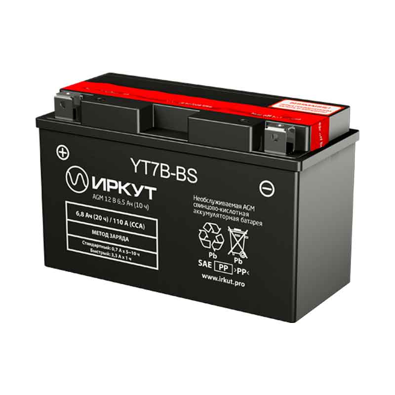 **Аккумулятор Иркут YT7B-BS (12V / 6.5Ah)**Сухозарядный стартерный аккумулятор Иркут YT7B-BS (напряжение 12 В, ёмкость 6.5 Ач) разработан специально для мототехники. Его главная особенность — повышенная виброустойчивость. Электролит поставляется отдельно, что обеспечивает повышенный срок хранения до заправки батареи. Иркут YT7B-BS производится по технологии AGM — кислота удерживается неподвижно внутри мелкопористых стекловолоконных сепараторов. Это повышает устойчивость к температурному воздействию. Дата производства аккумулятора Иркут YT7B-BS указана на крышке в виде символьного кода. Технические характеристики АКБ Иркут YT7B-BS Номинальное напряжение 12 В Число элементов 6 Ток холодной прокрутки 6.5 А Саморазряд (при 20 °С) менее 3% в месяц Особенности аккумулятора Иркут YT7B-BS Герметизированная конструкция Система внутренней рекомбинации газов с эффективностью 99% Низкий саморазряд Перевозка любым видом транспорта Применение аккумулятора Иркут YT7B-BS Мотоциклы Снегоходы Гидроциклы Транспортировка Стартерный аккумулятор Иркут YT7B-BS абсолютно безопасен и может перевозиться любым видом транспорта: морским, железнодорожным, автомобильным и даже воздушным. Перед отправкой надо убедиться, что на корпусе нет никаких трещин, следов протекания электролита и других дефектов. В противном случае аккумулятор является опасным грузом и до эксплуатации не допускается. Перевозите мотоаккумуляторы Иркут YT7B-BS на паллетах в вертикальном полодении (крышкой вверх). Не размещайте ничего поверх батарей. Клеммы всегда находятся под напряжением, они должны быть защищены специальными колпачками. Запрещено использовать рядом с аккумулятором токопроводящие предметы и жидкости. Не допускайте нагрева батарей от солнечного света, радиаторов отопления и других источников тепла. Оптимальная температура +20-25 . Подготовка к использованию Перед вводом в эксплуатацию необходимо подготовить аккумулятор. Иркут YT7B-BS — сухозарядная стартерная батарея, электролит поставляется отдельно. Как залить электролит: наденьте специальные защитные очки и маску поставьте аккумулятор вертикально (крышкой вверх) оторвите от батареи защитную ленту снимите крышку ёмкости с электролитом защитная фольга должна остаться неповреждённой переверните ёмкость с электролитом над аккумулятором — их отверстия должны совпасть вставьте ёмкость в соответствующие отверстия батареи плотно прижмите ёмкость и аккуратно надавите на неё для плотного прилегания не сильно постучите ладонью по дну ёмкости подождите 2 минуты пока электролит перетекает в аккумулятор снимите ёмкость из-под электролита закройте отверстия аккумулятора крышкой от ёмкости плотно вставьте её для создания герметичности через 20 минут проверьте напряжение батареи Заряд Правильная подзаряда продлит срок службы аккумулятора. Перед вводом в эксплуатацию ознакомьтесь с инструкцией от изготовителя и полностью зарядите батарею. Используйте автоматическое зарядное устройство. Убедитесь, что оно полностью соответствует вашему аккумулятору. Запрещено заряжать повреждённые и замёрзшие аккумуляторы, это опасно. Не допускайте нагрева батареи выше 50 , если это произошло — остановите подзарядку и дайте батарее остыть, уменьшите зарядный ток. Безопасность Во время работы со стартерным аккумулятором всегда используйте специаль