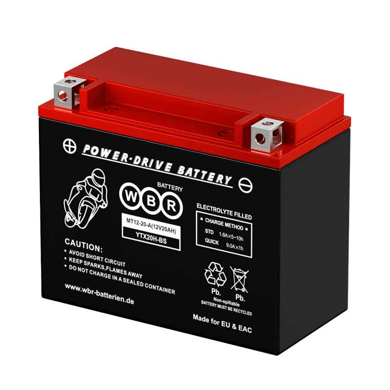**Аккумулятор WBR MT12-20-A (12V / 20Ah)**Стартерный аккумулятор WBR MT 12-20-A (напряжение 12 В, ёмкость 20 Ач, пусковой ток 310 А) разработан специально для мототехники, его главные особенности — повышенная виброустойчивость и работа в широком диапазоне температур (от -40 до +60 °С). Внутри герметичного корпуса из долговечного ABS-пластика происходит рекомбинация газов, а значит обслуживание батареи не требуется на протяжении всего периода эксплуатации. При правильном использовании срок службы аккумулятора достигает 5 лет (200 циклов при 100% глубине разряда). Дата производства аккумулятора WBR MT 12-20-A указана на крышке в виде символьного кода. Технические характеристики АКБ WBR MT 12-20-A Номинальное напряжение 12 В Число элементов 6 Ток холодной прокрутки 310 А Саморазряд (при 20 °С) 2% в месяц Особенности аккумулятора WBR MT 12-20-A Герметизированная конструкция Система внутренней рекомбинации газов с эффективностью 99% Низкий саморазряд Перевозка любым видом транспорта Применение аккумулятора WBR MT 12-20-A Мотоциклы Снегоходы Гидроциклы Садово-парковая техника Транспортировка Свинцово-кислотный аккумулятор WBR MT 12-20-A подходит для перевозки любым видом транспорта: морским, автомобильным, железнодорожным и воздушным. При соблюдении всех правил и рекомендаций изготовителя перевозка будет полностью безопасной. Батареи должны быть уложены на паллеты в один ряд в вертикальном положении крышкой верх. Размещать что-либо поверх них запрещено. Не допускайте их падения и опрокидывания. Соблюдайте температурный режим и следите, чтоб сами аккумуляторы не перегревались от прямого солнечного света и других источников тепла. Не кладите рядом с изделиями токопроводящие предметы и инструменты, клеммы должны быть снабжены специальными защитными колпачками. Не используйте рядом с батареями источники открытого огня, искр и приборы накаливания. Заряд Перед вводом в эксплуатацию аккумулятор необходимо подготовить. Проведите визуальный осмотр, если на корпусе присутствуют дефекты, трещины, следы протечки электролита или другие повреждения, то такую батарею нельзя допускать к работе, она должна быть утилизирована. Перед первым использованием полностью зарядите батарею. Рекомендуется использовать автоматическое зарядное устройство, при использовании обычного зарядного устройства необходимо контролировать весь процесс зарядки. Оптимальный ток заряда составляет 10% от заявленной ёмкости батареи. Время заряда таким током составит около 10 часов, для более быстрой подзарядки допускается использовать большее значение, но оно не должно превышать заявленный параметр «Максимальный зарядный ток». Рекомендуемые настройки можно посмотреть в таблице: Таблица зарядки WBR MT 12-20-A Номинальная ёмкость, Ач (10 ч) Номинальное напряжение, В Время заряда при токе до 1 А Время заряда при токе до 1.5 А Время заряда при токе до 2 А 3-4 12 1-4 ч - - 5-8 12 1-8 ч 1-6 ч 1-4 ч 9-12 12 2-12 ч 1,5-8 ч 1-6 ч 14-19 12 4-19 ч 3-13 ч 2-10 ч 20-30 12 5-30 ч 4-20 ч 3-15 ч Проверка заряда После полной зарядки аккумулятора необходимо, чтобы он отстоялся 30-60 минут. После этого необходимо проверить напряжение открытой цепи, оно не должно быть ниже 12.7 В и не выше 14.4 В. При низком значении поставьте батарею на дозарядку, её время должно составлять 40% от времени полного заряда (4 часа дополнительной при 10 часах полной). Установка Перед началом замены батареи отключите все при
