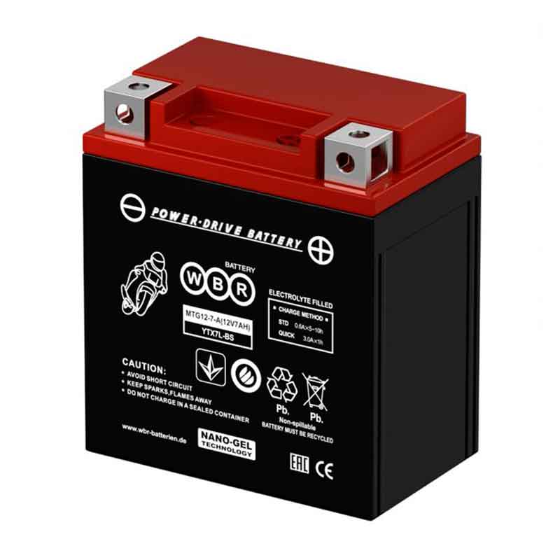**Аккумулятор WBR MTG 12-7-A (12V / 7Ah)**Стартерный аккумулятор WBR MTG 12-7-A (напряжение 12 В, ёмкость 7 Ач, пусковой ток 85 А) разработан с применением технологии NANO-GEL. Это обеспечивает батареи ряд преимуществ: повышенную устойчивость к глубоким разрядам, работоспособность даже при низких температурах и больший, чем у AGM аккумуляторов, циклический ресурс. Корпус полностью герметичен и выполнен из долговечного ABS-пластика, для регулировки давления на крышке предусмотрен односторонний клапан. WBR MTG 12-7-A обладает высоким пусковым током и подходит для эксплуатации в российском климате. Дата производства аккумулятора WBR MTG 12-7-A указана на крышке в виде символьного кода. Технические характеристики АКБ WBR MTG 12-7-A Номинальное напряжение 12 В Число элементов 6 Ток холодной прокрутки 85 А Саморазряд (при 20 °С) 2% в месяц Особенности аккумулятора WBR MTG 12-7-A Герметизированная конструкция Система внутренней рекомбинации газов с эффективностью 99% Низкий саморазряд Перевозка любым видом транспорта Применение аккумулятора WBR MTG 12-7-A Мотоциклы Снегоходы Гидроциклы Садово-парковая техника Транспортировка Свинцово-кислотный аккумулятор WBR MTG 12-7-A подходит для перевозки любым видом транспорта: морским, автомобильным, железнодорожным и воздушным. При соблюдении всех правил и рекомендаций изготовителя перевозка будет полностью безопасной. Батареи должны быть уложены на паллеты в один ряд в вертикальном положении крышкой верх. Размещать что-либо поверх них запрещено. Не допускайте их падения и опрокидывания. Соблюдайте температурный режим и следите, чтоб сами аккумуляторы не перегревались от прямого солнечного света и других источников тепла. Не кладите рядом с изделиями токопроводящие предметы и инструменты, клеммы должны быть снабжены специальными защитными колпачками. Не используйте рядом с батареями источники открытого огня, искр и приборы накаливания. Заряд Перед вводом в эксплуатацию аккумулятор необходимо подготовить. Проведите визуальный осмотр, если на корпусе присутствуют дефекты, трещины, следы протечки электролита или другие повреждения, то такую батарею нельзя допускать к работе, она должна быть утилизирована. Перед первым использованием полностью зарядите батарею. Рекомендуется использовать автоматическое зарядное устройство, при использовании обычного зарядного устройства необходимо контролировать весь процесс зарядки. Оптимальный ток заряда составляет 10% от заявленной ёмкости батареи. Время заряда таким током составит около 10 часов, для более быстрой подзарядки допускается использовать большее значение, но оно не должно превышать заявленный параметр «Максимальный зарядный ток». Проверка заряда После полной зарядки аккумулятора необходимо, чтобы он отстоялся 30-60 минут. После этого необходимо проверить напряжение открытой цепи, оно не должно быть ниже 12.7 В и не выше 14.4 В. При низком значении поставьте батарею дозарядку, её время должно составлять 40% от времени полного заряда (4 часа дополнительной при 10 часах полной). Установка Перед началом замены батареи отключите все приборы на транспортном средстве и зажигание. Посмотрите и запомните, как располагаются выводы, отключите положительный, а затем отрицательный. Проверьте концы кабелей на наличие коррозии и оксидной плёнки, рекомендуется зачистить их металлической щёткой или наждач