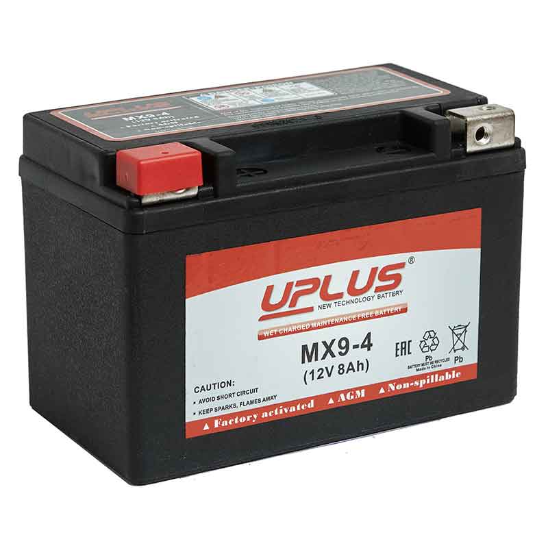 **Мото аккумулятор UPLUS MX9-4 (12V 8Ah) (YTX9)**Аккумулятор Uplus MX9-4 (ёмкость 8 Ач, напряжение 12 В) разработан специально для мототехники по технологии AGM. Специальная конструкция пластин батареи обеспечивает на 10-20% большее время непрерывного запуска и отличную пусковую мощность, позволяющую запускать двигатель даже при низком заряде. Пусковой ток составляет (CCA) 120 А, полярность клемм у батареи прямая (+-). Корпус из прочного полимера надёжно запаян, что защищает АКБ от протеканий и обеспечивает повышенную виброустойчивость. Благодаря сульфатоустойчивым пластинам Uplus MX9-4 обладает продолжительным сроком службы, он достигает 5 лет при правильной эксплуатации. Обслуживание не требуется. Мото аккумулятор активирован на заводе и полностью готов к эксплуатации. АКБ Uplus MX9-4 можно использовать в широком температурном спектре: от -40 до +40 °C. Это позволяет применять батарею не только для мотоциклов, квадроциклов, садовой и спецтехники, но и в зимний период для снегоходов. Свинцово-кислотный мотоаккумулятор Uplus MX9-4 является полным аналогом следующих моделей: YTX9. Особенности UPLUS MX9-4 Повышенная виброустойчивость Срок службы до 5 лет Полностью герметичны (не требуют долива электролита) Технология AGM Высокие пусковые и стартерные характеристики Применение UPLUS MX9-4 Мотоциклы Скутеры Квадроциклы Снегоходы Водная техника Газонокосилки и садовая техника Транспортировка Во время перевозки аккумулятора необходимо соблюдать температурный режим: не допускайте нагрева батарей от солнечного света, отопительных приборов и других источников тепла. Клеммы всегда находятся под напряжением и должны быть защищены специальными колпачками. Запрещено класть поверх АКБ и рядом с ними токопроводящие предметы и жидкости. Не размещайте ничего поверх аккумуляторов, они должны перевозиться строго в вертикальном положении клеммами вверх, уложенными на паллеты в один ряд и закреплены во избежание падения или опрокидывания. Перед транспортировкой обязательно осмотрите изделия, на корпусе не должно быть следов протекания электролита, трещин и других дефектов. Повреждённые АКБ перевозятся как груз 8 класса опасности. Подготовка к эксплуатации Перед началом использования изучите инструкцию от производителя, её можно найти во вкладке «Документы». Проверьте целостность батареи, повреждённые АКБ опасны и до эксплуатации не допускаются. Проверьте уровень заряда аккумулятора, при необходимости дозарядите его. Убедитесь, что зарядное устройство полностью соответствует АКБ, выставьте подходящие параметры и не оставляйте батарею без присмотра на время подзарядки. Перед подключением зачистите контакты кабелей и клеммы от коррозии и оксидной плёнки. Используйте средства индивидуальной защиты, чтобы не получить поражение электричеством. Установите АКБ в специальную нишу, начните подключения с положительного (+) ввода. Заряд Правильная и своевременная подзарядка АКБ позволит ему прослужить дольше. Сначала необходимо подобрать подходящее зарядное устройство. Используйте автоматическое ЗУ, чтобы избежать недо-, перезаряда батарей и других проблем. Рекомендуется дозаряжать батареи после каждого использования до 100%. Не оставляйте АКБ на подзарядке без присмотра, следите за их температурами, содержите изделия в чистоте. Помещение для заряда должно быть сухим, тёплым и хоро