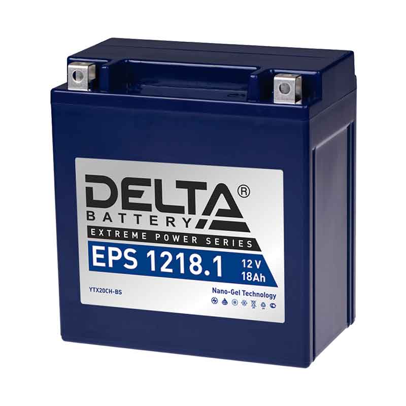 **Мото аккумулятор Delta EPS 1218.1 (12V / 18Ah / 195A (CCA))**Стартерный аккумулятор Delta EPS 1218.1 (напряжение 12 В, ёмкость 18 Ач, ток 230 А) разработан с применением технологии NANO-GEL. Главные особенности батареи: повышенная вибростойкость, устойчивость к глубоким разрядам, способность полностью восстанавливаться после них и широкий диапазон рабочих температур. Delta EPS 1218.1 может использоваться в любом положении, она полностью герметична. Материал корпуса — долговечный ABS пластик, стенки усилены сетчатыми рёбрами жёсткости. На протяжении всего периода эксплуатации (до 5 лет) долив воды и электролита не требуется. Дата производства аккумулятора Delta EPS 1218.1 указана на крышке в виде символьного кода. Технические характеристики АКБ Delta EPS 1218.1 Номинальное напряжение 12 В Число элементов 6 Ток холодной прокрутки 230 А Саморазряд (при 20 °С) менее 3% в месяц Особенности аккумулятора Delta EPS 1218.1 Герметизированная конструкция Система внутренней рекомбинации газов с эффективностью 99% Низкий саморазряд Перевозка любым видом транспорта Применение аккумулятора Delta EPS 1218.1 Мотоциклы Снегоходы Гидроциклы Садово-парковая техника Транспортировка Аккумулятор Delta EPS 1218.1 подходит для перевозки любым видом транспорта: автомобильным, железнодорожным, морским и воздушным. Для полностью безопасной перевозки необходимо соблюдать правила и рекомендации изготовителя. Поддерживайте температурный режим +20-25 °С, не допускайте нагрева батарей от прямого солнечного света и других источников тепла. Аккумуляторы должны перевозиться на паллетах в вертикальном положении крышкой вверх. Размещать что-либо поверх них категорически запрещено. Влажность воздуха не должна превышать 80%. Запрещено использовать вблизи батарей жидкости, токопроводящие предметы, источники открытого огня, искр и приборы накаливания. Заряд Перед вводом в эксплуатацию полностью зарядите батарею. Используйте для этого автоматическое зарядное устройство, убедитесь, что оно полностью подходит аккумулятору. Предварительно осмотрите изделие на наличие трещин, следов протечки электролита и других дефектов, повреждённые батареи к использованию не допускаются и должны быть отправлены на утилизацию. Рекомендуется заряжать током, равным 10% от ёмкости батареи, длительность такого заряда составляет порядка 10 часов. Для более быстрой подзарядки допускается использовать большее значение силы тока, но не превышающий параметр «Максимальный зарядный ток». В таблице представлены настройки для аккумуляторов различной ёмкости.: Таблица зарядки Delta EPS 1218.1 Номинальная ёмкость, Ач (10 ч) Номинальное напряжение, В Время заряда при токе до 1 А Время заряда при токе до 1.5 А Время заряда при токе до 2 А 3-4 12 1-4 ч - - 5-8 12 1-8 ч 1-6 ч 1-4 ч 9-12 12 2-12 ч 1,5-8 ч 1-6 ч 14-19 12 4-19 ч 3-13 ч 2-10 ч 20-30 12 5-30 ч 4-20 ч 3-15 ч Проверка заряда После полного заряда аккумулятора дайте ему отстояться около часа. После этого замеряйте напряжение свободной цепи, оно должно находиться в пределах от 12.7 В до 14.4 В. При заниженном значении показателя поставьте батарею на дозарядку, её время должно составлять 40% времени полного заряда. Эксплуатация при напряжении 14.6 В и выше приводит к повреждению аккумулятора, сокращению срока службы и снижению мощности. Установка Снимите установленный аккумулятор, запомните расположение положительного вывода. Концы кабелей необходимо зачистить металличе