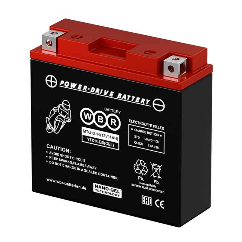 **Аккумулятор WBR MTG 12-14 (12V / 14Ah)**Стартерный аккумулятор WBR MTG 12-14 (напряжение 12 В, ёмкость 14 Ач, пусковой ток 210 А) разработан с применением технологии NANO-GEL. Это обеспечивает батареи ряд преимуществ: повышенную устойчивость к глубоким разрядам, работоспособность даже при низких температурах и больший, чем у AGM аккумуляторов, циклический ресурс. Корпус полностью герметичен и выполнен из долговечного ABS-пластика, для регулировки давления на крышке предусмотрен односторонний клапан. WBR MTG 12-14 обладает высоким пусковым током и подходит для эксплуатации в российском климате. Дата производства аккумулятора WBR MTG 12-14 указана на крышке в виде символьного кода. Технические характеристики АКБ WBR MTG 12-14 Номинальное напряжение 12 В Число элементов 6 Ток холодной прокрутки 210 А Саморазряд (при 20 °С) 2% в месяц Особенности аккумулятора WBR MTG 12-14 Герметизированная конструкция Система внутренней рекомбинации газов с эффективностью 99% Низкий саморазряд Перевозка любым видом транспорта Применение аккумулятора WBR MTG 12-14 Мотоциклы Снегоходы Гидроциклы Садово-парковая техника Транспортировка Свинцово-кислотный аккумулятор WBR MTG 12-14 подходит для перевозки любым видом транспорта: морским, автомобильным, железнодорожным и воздушным. При соблюдении всех правил и рекомендаций изготовителя перевозка будет полностью безопасной. Батареи должны быть уложены на паллеты в один ряд в вертикальном положении крышкой верх. Размещать что-либо поверх них запрещено. Не допускайте их падения и опрокидывания. Соблюдайте температурный режим и следите, чтоб сами аккумуляторы не перегревались от прямого солнечного света и других источников тепла. Не кладите рядом с изделиями токопроводящие предметы и инструменты, клеммы должны быть снабжены специальными защитными колпачками. Не используйте рядом с батареями источники открытого огня, искр и приборы накаливания. Заряд Перед вводом в эксплуатацию аккумулятор необходимо подготовить. Проведите визуальный осмотр, если на корпусе присутствуют дефекты, трещины, следы протечки электролита или другие повреждения, то такую батарею нельзя допускать к работе, она должна быть утилизирована. Перед первым использованием полностью зарядите батарею. Рекомендуется использовать автоматическое зарядное устройство, при использовании обычного зарядного устройства необходимо контролировать весь процесс зарядки. Оптимальный ток заряда составляет 10% от заявленной ёмкости батареи. Время заряда таким током составит около 10 часов, для более быстрой подзарядки допускается использовать большее значение, но оно не должно превышать заявленный параметр «Максимальный зарядный ток». Рекомендуемые настройки можно посмотреть в таблице: Таблица зарядки WBR MTG 12-14 Номинальная ёмкость, Ач (10 ч) Номинальное напряжение, В Время заряда при токе до 1 А Время заряда при токе до 1.5 А Время заряда при токе до 2 А 3-4 12 1-4 ч - - 5-8 12 1-8 ч 1-6 ч 1-4 ч 9-12 12 2-12 ч 1,5-8 ч 1-6 ч 14-19 12 4-19 ч 3-13 ч 2-10 ч 20-30 12 5-30 ч 4-20 ч 3-15 ч Проверка заряда После полной зарядки аккумулятора необходимо, чтобы он отстоялся 30-60 минут. После этого необходимо проверить напряжение открытой цепи, оно не должно быть ниже 12.7 В и не выше 14.4 В. При низком значении поставьте батарею дозарядку, её время должно составлять 40% от времени полного заряда (4 часа дополнительной при 10 часах полной). Установка Перед началом замены 
