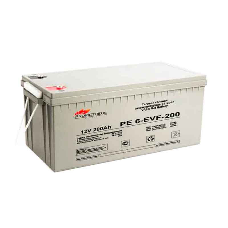 **Аккумулятор тяговый Prometheus PE 6-EVF-200 (12V / 226Ah)**Тяговый аккумулятор Prometheus PE 6-EVF-200 выпускается напряжением 12 В и ёмкостью 226 Ач по технологии GEL — электролит загущен до желеобразного состояния. Это обеспечивает повышенную устойчивость аккумулятора к глубоким разрядами и воздействию температур. Батарея производится в прочном герметичном корпусе — обслуживание на протяжении всего срока службы не требуется. На крышке предусмотрен VRLA клапан, сбрасывающий избыточное давление. Тяговый аккумулятор Prometheus PE 6-EVF-200 подходит для большинства электрооборудования: велосипеды, самокаты, трициклы, тележки, инструменты, поломоечные машины, погрузочная и складская техника. При правильной эксплуатации батарея выдерживает до 700 циклов заряд-разряд при DOD = 80%. Дата производства аккумулятора Prometheus PE 6-EVF-200 указана на крышке в виде символьного кода. Технические характеристики АКБ Prometheus PE 6-EVF-200 Номинальное напряжение 12 В Число элементов 6 Саморазряд (при 20 °С) менее 3% в месяц Особенности аккумулятора Prometheus PE 6-EVF-200 Необслуживаемый аккумулятор (технология GEL) Устойчивость к длительным глубоким разрядам Широкий диапазон рабочих температур Не требует отдельной зарядной комнаты Применение аккумулятора Prometheus PE 6-EVF-200 Электросамокаты Погрузочно-разгрузочная техника Подъёмно-тяговая техника Складская техника Поломоечная техника Транспортировка Тяговый аккумулятор Prometheus PE 6-EVF-200 полностью безопасен при перевозке. Перед отправкой необходимо убедиться, что батарея не имеет никаких повреждений. Если на ней обнаружены трещины, следы протекания электролита и другие дефекты, то она должна быть отправлена на утилизацию. Использовать и перевозить такие аккумуляторы нельзя, это опасно. Соблюдайте температурный режим, не допускайте нагрева батарей от прямого солнечного света, отопительных приборов и других источников тепла. Клеммы на время перемещений должны быть защищены специальными колпачками. Класть что-либо поверх аккумулятора запрещено, они перевозятся на паллетах, уложенные в один ряд вертикально (крышкой вверх). При соблюдении всех рекомендаций Prometheus PE 6-EVF-200 является полностью безопасным при перевозке. Допускается использовать любой вид транспорта: воздушный, автомобильный, морской, речной, железнодорожный. Эксплуатация Внимательно изучите инструкцию по эксплуатации от производителя. Перед началом использования полностью зарядите аккумулятор. Prometheus PE 6-EVF-200 работает при температуре от -35 до +50 °C. Рекомендуется соблюдать температурный режим, это продлит срок службы батареи. Не снимайте с аккумулятора больше его заявленной ёмкости и не разряжайте его током, превышающим максимальный разрядный ток. Это опасно и может привести к разрушению батареи, серьёзным травмам и порче оборудования. Убедитесь, что техника полностью соответствует вашему аккумулятору. Избегайте глубоких разрядов, они негативно сказываются на характеристиках и сроке службы батареи. Подбирайте ёмкость с запасом в 20-30%, так изделие прослужит дольше. Заряд Полностью заряжайте Prometheus PE 6-EVF-200 после каждого использования. Убедитесь, что зарядное устройство полностью совместимо с аккумулятором. Рекомендуется заряжать автоматическим ЗУ, это позволит избежать недо- и перезаряда батарей. Оптимальный ток заряда составляет 10% от номинальной ёмкости батареи. Заряд при этом длится поряд