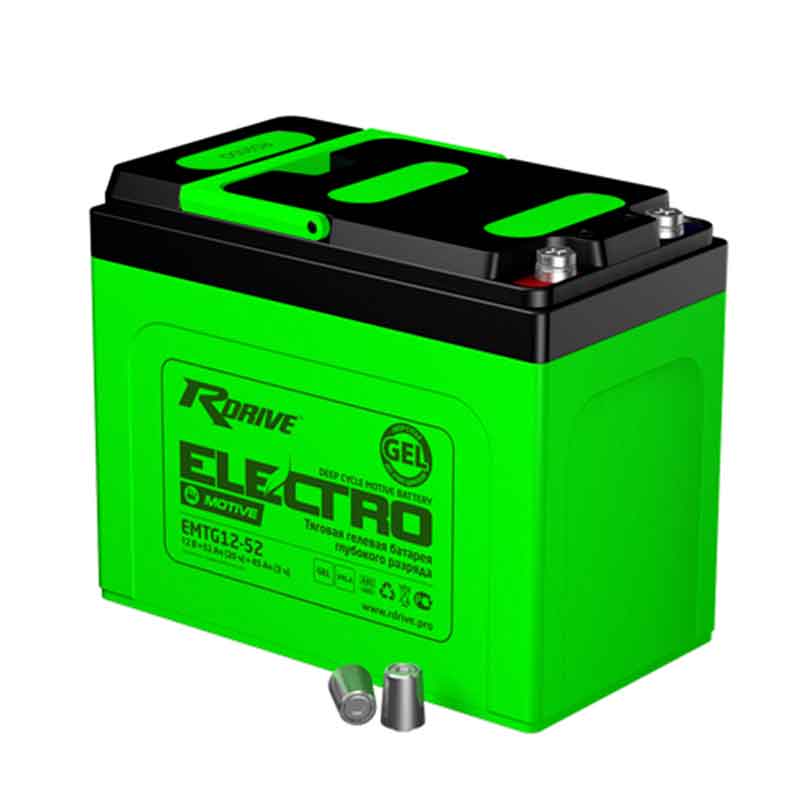 **Аккумулятор тяговый RDrive EMTG12-52N (12V / Ah C5) GEL**Тяговый аккумулятор RDrive EMTG12-52N (ёмкость 52 Ач, напряжение 12 В) разработан по технологии GEL. Электролит внутри батареи загущен до состояния геля. Это значительно повышает устойчивость к воздействию вибраций, глубоких разрядов и температур. Обслуживать батарею на протяжении всего срока службы не требуется. Прочный герметичный корпус поддерживает давление, необходимое для рекомбинации газов внутри аккумулятора. На крышке расположен VRLA клапан, сбрасывающий избыточное давление. Дата производства аккумулятора RDrive EMTG12-52N указана на крышке в виде символьного кода. Технические характеристики АКБ RDrive EMTG12-52N Номинальное напряжение 12 В Число элементов 6 Саморазряд (при 20 °С) менее 3% в месяц Особенности аккумулятора RDrive EMTG12-52N Необслуживаемый аккумулятор (технология GEL) Устойчивость к длительным глубоким разрядам Широкий диапазон рабочих температур Не требует отдельной зарядной комнаты Применение аккумулятора RDrive EMTG12-52N Электросамокаты Погрузочно-разгрузочная техника Подъёмно-тяговая техника Складская техника Поломоечная техника Транспортировка Тяговый аккумулятор RDrive EMTG12-52N подходит для перевозки любым видом транспорта. Перед отправкой убедитесь, что на корпусе нет трещин, следов протекания электролита и других дефектов. Клеммы должны быть защищены специальными колпачками. Не используйте вблизи них токопроводящие предметы и жидкости. Не допускайте нагрева RDrive EMTG12-52N от солнечного света и других источников тепла. Аккумуляторы должны укладываться на паллеты в один ряд в вертикальном положении (крышкой вверх). Перевозить RDrive EMTG12-52N можно морским, автомобильным, железнодорожным и воздушным транспортом. При соблюдении всех правил и рекомендаций это безопасно. Заряд Внимательно изучите инструкцию от производителя. Перед первым использование полностью зарядите аккумулятор. Для этого используйте автоматическое зарядное устройство. Убедитесь, что оно полностью соответствует батарее. Рекомендуемый ток заряда составляет 10% от номинальной ёмкости. Для более быстрой подзарядки можно выставить максимальный зарядный ток или значение ниже него. Превышать этот параметр запрещено, это опасно. Полностью заряжайте аккумулятор после каждого использования, это существенно продлит срок его службы. Эксплуатация От правильности эксплуатации и своевременного ухода зависит срок службы аккумулятора и его разрядные характеристики. Пиковая мощность достигается после 50-100 рабочих циклов, а необходимая температура +27 °С. Рекомендуется не разряжать аккумулятор более 80%. Повреждённые батареи опасны и до эксплуатации не допускаются. Перед каждым использованием полностью зарядите аккумулятор и проверьте уровень электролита (для гелевых батарей это не требуется). Следите, чтобы RDrive EMTG12-52N был чистым и сухим, а относительная влажность воздуха не превышала 80%. Не используйте батареи в герметичных пространствах, предусмотрите вытяжную вентиляцию. Загрязнение способствует образованию токопроводящей плёнки, она ускоряет саморазряд и может быть причиной короткого замыкания и поражения электрическим током. Чистить аккумулятор допускается только чистой хлопчатобумажной тряпкой, использование чистящих средств, растворителей и тканей, накапливающих статический заряд, запрещено. Влага ускоряет коррозию к