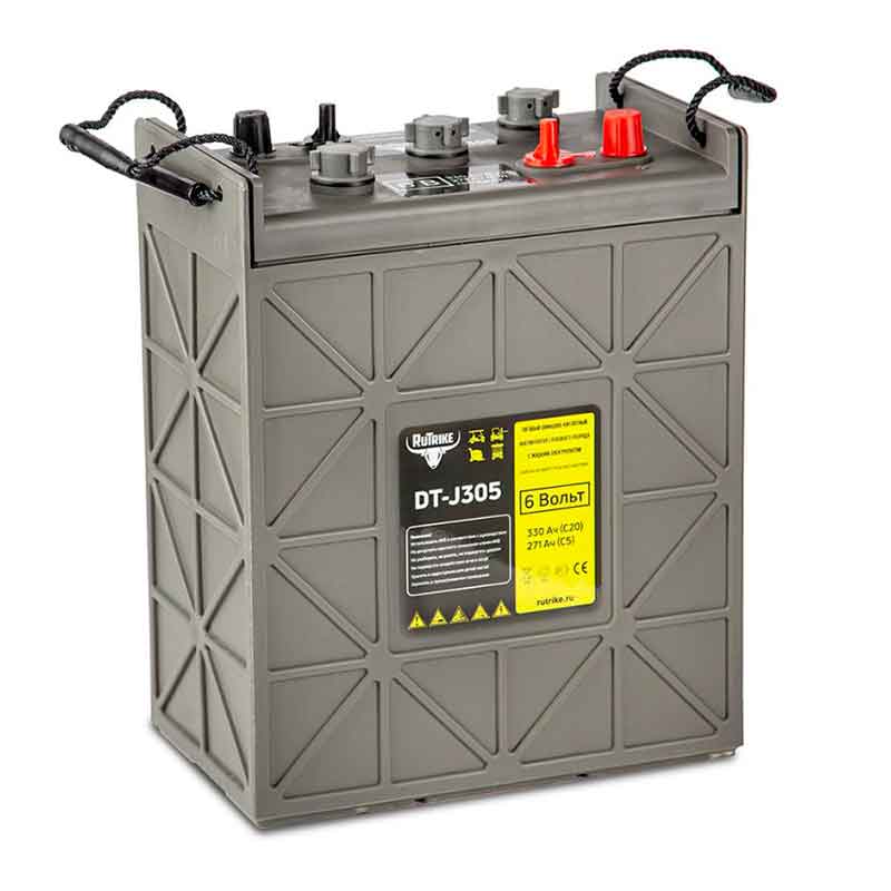 **Аккумулятор тяговый Rutrike DT-J305 (6V / 271Ah C5) WET**Свинцово-кислотный тяговый аккумулятор RuTrike DT-J305 (ёмкость 330 Ач, напряжение 6 В) производится по технологии WET и рекомендован для техники на электрической тяге. Электролит загущен до желеобразного состояния, благодаря чему батарея более устойчива к температурному воздействию и глубоким разрядам. Сухозаряженные аккумуляторы отличаются повышенным числом циклов заряд-разряд: более 700 при DOD (глубине разряда) 80%. Пластины тягового аккумулятора снабжены более плотным активным материалом, благодаря этому они устойчивы к глубоким разрядам и не теряют ёмкость. Тяговый аккумулятор RuTrike DT-J305 применяется в различной технике с электродвигателями. Корпус выполнен из ударопрочного ABS пластика и надёжно герметизирован. На крышке аккумулятора RuTrike DT-J305 предусмотрен односторонний клапан избыточного давления. Дата производства аккумулятора RuTrike DT-J305 указана на крышке в виде символьного кода. Технические характеристики АКБ RuTrike DT-J305 Тип АКБ Тяговый WET аккумулятор Ёмкость за 20 часов разряда (С20) Ач 330 Время заряда батареи 8-10 часов Габариты (мм) Д x Ш x В 296*176*366 Рабочее напряжение, В 6 Клеммы DT-5/16 Вес (кг) 42 Диапазон рабочей температуры от -20°С до +50°С Материал корпуса ABS пластик Гаранитя 12 мес. Особенности аккумулятора RuTrike DT-J305 Увеличенное время поездки без подзаряда Устойчивость к глубоким разрядам Прочный огнестойкий корпус из ABS пластика Повышенная виброустойчивость Герметичная конструкция с VRLA клапаном Более 700 циклов при DOD 80% Применение аккумулятора RuTrike DT-J305 Электросамокаты Электрические тележки Электровелосипеды Электромотоциклы Электроскутеры Электроинструменты Транспортировка батареи При соблюдении всех правил перевозки и рекомендаций изготовителя тяговые аккумуляторы RuTrike DT-J305 полностью безопасны при транспортировке. Их допускается перевозить воздушным, морским, речным, автомобильным и железнодорожным транспортом. Батареи с трещинами, дефектами, следами протекания электролита и другими повреждениями перевозятся как опасный груз и до эксплуатации не допускаются. Перед транспортировкой убедитесь, что клеммы защищены специальными колпачками, а сами аккумуляторы расположены вертикально крышкой вверх. Не кладите ничего поверх изделий, не допускайте их падения и опрокидывания. Рекомендуемая температура на время перевозки +20-25 °С, не допускайте нагрева аккумуляторов от радиаторов отопления, солнечного света и других источников тепла. Заряд Внимательно и полностью изучите инструкцию изготовителя. Перед каждым использованием полностью заряжайте аккумулятор, это продлит срок его службы. Рекомендуется заряжать батарею током, равным 10% её номинальной ёмкости. Подзарядка таким током занимает 8-10 часов. Для более быстрого подзаряда допускается использовать большее значение, но оно не должно превышать Максимальный зарядный ток (см. в инструкции). При длительном хранении дозаряжайте аккумуляторы до 100%, чтобы компенсировать саморазряд. Рекомендуется использовать автоматическое зарядное устройство. Разряд Не снимайте с аккумулятора больше его номинальной ёмкости. Это может привести к снижению срока службы и даже его разрушению. Не допускайте частых глубоких разрядов, это негативно сказывается на характеристиках батареи. Подбирайте аккумулятор с запасом ёмкости 20-30%. После каждого разря
