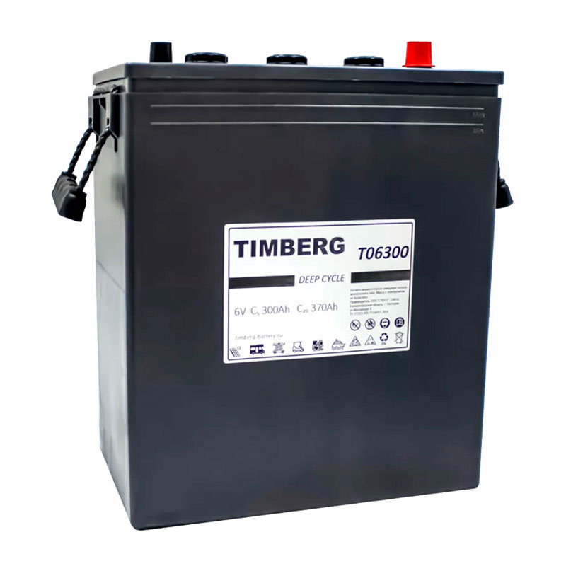 **Аккумулятор тяговый Timberg T06300 (6V / 300Ah C5) WET**Тяговый аккумулятор Timberg T06300 (ёмкость C5 = 300 Ач, напряжение 6 В) производится по технологии Wet (с жидким электролитом). Аккумулятор является обслуживаемым. Такие батареи эксплуатируются только в вертикальном положении (крышкой вверх). Необходимо отслеживать уровень электролита, если он опустился ниже отметки, то нужно долить воды в аккумулятор. Панцирные положительные электроды тягового аккумулятора глубокого разряда Timberg T06300 обеспечивают максимальную отдачу и накопление энергии в течении длительного времени. Благодаря этому Timberg T06300 работает в 2 раза дольше аналогичных АКБ с намазными пластинами. Тяговый аккумулятор Timberg T06300 применяется в следующих приборах с электродвигателем: Haulotte Star 10, Haulotte HM 10, XILIN CDDK 15-III, Cleanfix, Columbus, Comac, Nilfisk, Greenland. Технические характеристики АКБ Timberg T06300 Номинальное напряжение 6 В Число элементов 3 Саморазряд (при 20 °С) менее 3% в месяц Особенности аккумулятора Timberg T06300 Технология WET Время работы в 2 раза больше Высокие разрядные характеристики Панцирные электроды Применение аккумулятора Timberg T06300 Поломоечные машины Погрузочно-разгрузочная техника Подъёмно-тяговая техника Складская техника Гольфкары Транспортировка Помимо большого веса заправленных аккумуляторов необходимо учитывать и то, что клеммы всегда находятся под напряжением. Поэтому во время перевозки они должны быть защищены специальными колпачками. Транспортировать тяговые аккумуляторы допускается только в вертикальном положении крышкой вверх. Батареи должны быть надёжно закреплены чтобы избежать падения и опрокидывания. Класть что-либо поверх изделий и использовать вблизи них токопроводящие предметы, жидкости, источники открытого огня и искр категорически запрещено. Не допускайте нагрева аккумуляторов от солнечного света, приборов отопления и других источников тепла. Повреждённые батареи опасны и должны перевозиться как груз 8 класса. Подготовка к использованию Перед началом использования батарей проведите визуальный осмотр: на корпусе не должно быть трещин, вмятин, следов протекания электролита и никаких других дефектов. Повреждённые изделия до эксплуатации не допускаются и должны быть утилизированы. Внимательно ознакомьтесь с документацией от производителя и после этого полностью зарядите АКБ. Убедитесь, что на корпусе нет грязи и оксидной плёнки. Клеммы должны быть без следов коррозии. Если таковые имеются, то их необходимо зачистить мелкой наждачной бумагой. Не забывайте использовать средства индивидуальной защиты от электрического тока. Заряд Перед установкой полностью зарядите аккумулятор. Используйте для этого автоматическое зарядное устройство. Убедитесь, что оно полностью соответствует параметрам батареи. Оптимальный ток заряда составляет 10% от номинальной ёмкости АКБ. Заряд таким током займёт около 8-10 часов. На это время не оставляйте аккумуляторы без присмотра и следите за их температурой — корпус не должен нагреваться до 50 °С и выше. Если это произошло: отключите зарядное устройство от батареи и дайте ей остыть, выставьте более низкие параметры заряда и возобновите подзарядку. По возможности полностью заряжайте АКБ после каждого использования, перед длительным хранением и каждые 3 месяца простоя. Разряд Перед установкой аккумулятора в электроприбор, убедитесь, ч