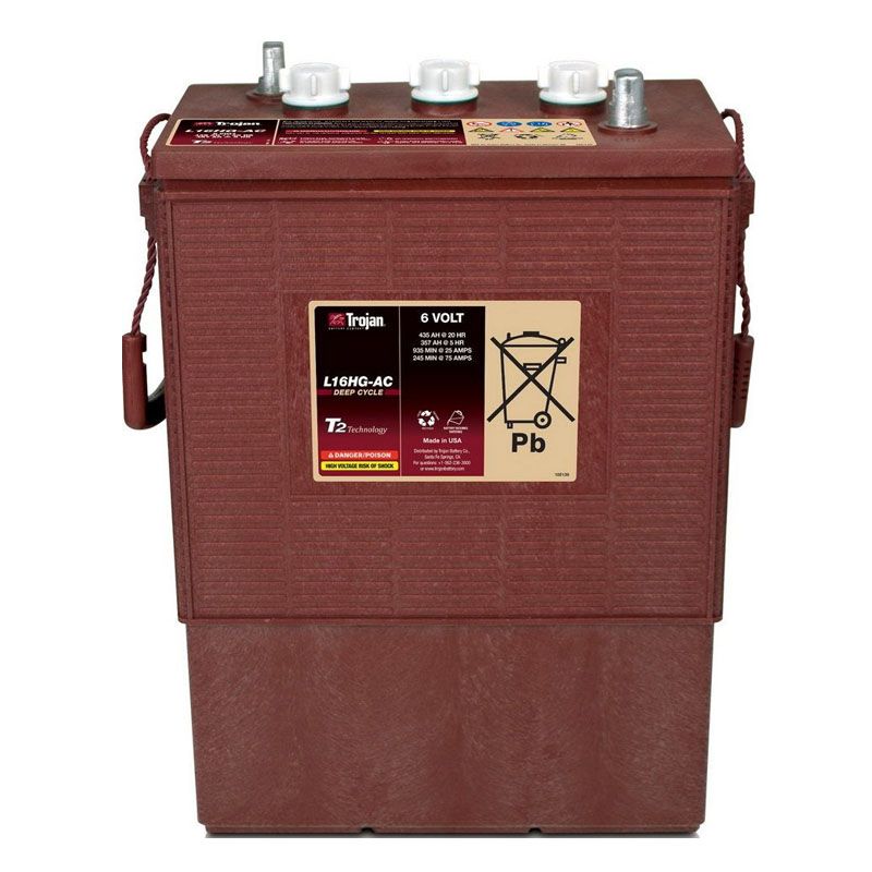 **Аккумулятор тяговый Trojan L16HG-AC (6V /357Ah)**Тяговый аккумулятор Trojan L16HG-AC (напряжение 6 В, ёмкость C5 357 Ач) с жидким электролитом применяется для подъёмно-тяговой, поломоечной, грузовой техники и других электродвигателей. Прочный корпус надёжно защищает батарею от протекания электролита. Trojan L16HG-AC устойчив к глубоким разрядам и работает в широком диапазоне температур. Аккумулятор обслуживаемый, а значит необходимо проверять уровень воды и доливать её при необходимости. Это повышает срок службы и количество циклов заряда-разряда. Дата производства аккумулятора Trojan L16HG-AC указана на крышке в виде символьного кода. Технические характеристики АКБ Trojan L16HG-AC Номинальное напряжение 6 В Число элементов 3 Саморазряд (при 20 °С) менее 3% в месяц Особенности аккумулятора Trojan L16HG-AC Необслуживаемый аккумулятор (технология Dryfit) Устойчивость к длительным глубоким разрядам Широкий диапазон рабочих температур Не требует отдельной зарядной комнаты Применение аккумулятора Trojan L16HG-AC Яхты и катера Погрузочно-разгрузочная техника Подъёмно-тяговая техника Складская техника Поломоечная техника Транспортировка Аккумуляторы Trojan L16HG-AC допускается перевозить любым видом транспорта (даже воздушным), так как они полностью безопасны. Но следует всегда помнить и соблюдать правила транспортировки и рекомендации изготовителя. Батареи обладают большим удельным весом, а внутри корпуса находится кислота. Надёжно закрепите аккумуляторы в вертикальном положении (крышкой вверх), чтобы исключить возможность их падения и опрокидывания. Не кладите ничего поверх батарей и не устанавливайте их друг на друга, их необходимо уложить на паллеты в один ряд. Клеммы находятся под напряжением, на время транспортировки на них должны быть защитные колпачки. Запрещено использовать вблизи аккумуляторов жидкости, металлические изделия и другие вещи, проводящие электрический ток. Соблюдайте температурный режим (+20-25 °С) и защищайте батареи от воздействия источников тепла и прямого солнечного света. Не курите вблизи аккумуляторов, не используйте источники открытого огня, искр и приборы накаливания. Соблюдение этих простых правил сделает перевозку Trojan L16HG-AC безопасной. Заряд Перед началом использования Trojan L16HG-AC осмотрите корпус на наличие трещин, протечек и других дефектов. Повреждённые аккумуляторы до работы не допускаются и должны быть утилизированы. Внимательно изучите инструкцию от производителя и подготовьте батарею к зарядке. Перед каждым вводом в эксплуатацию полностью заряжайте изделия. Используйте автоматическое зарядное устройство, оно подбирает оптимальные параметры заряда и необходимое время. Перед подзарядкой проверьте уровень электролита, если он не закрывает пластины, то необходимо долить воды (не актуально для гелевых аккумуляторов). Во всех остальных случаях обслуживание происходит после полной подзарядки батарей. Следите за температурами, низкие снижают полезную ёмкость, а высокие повышают, это вызывает недозаряд и перезаряд соответственно. Они негативно сказываются на характеристиках изделия и уменьшают срок службы. Полностью заряжайте Trojan L16HG-AC после каждого использования, во время и после длительного хранения. Эксплуатация От правильности эксплуатации и своевременного ухода зависит срок службы аккумулятора и его разрядные характеристики. Пик