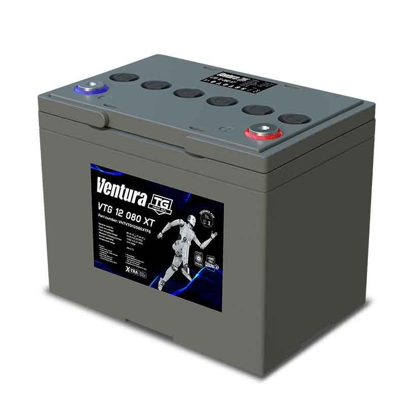 **Аккумулятор тяговый Ventura VTG 12 080 XT (12V / 71Ah C5) GEL**Премиальный тяговый аккумулятор Ventura VTG 12 080 XT напряжением 12 В ёмкостью 71 Ач производится по технологии TRUE GEL (TRUE GEL X-TRA) с применением улучшенной конструкции с усиленными решётками. Главная особенность серии — съёмные конусные выводы A-POL, позволяющие легко менять тип клемм на резьбу под болт. Электролит находится в загущенном желеобразном состоянии, что обеспечивает повышенную надёжность, устойчивость к вибрациям, перепадам температур и глубоким разрядам. Тяговая гелевая батарея Ventura VTG 12 080 XT подходит для работы как в буферном режиме, так и в циклическом, обеспечивая до 15 лет работы или 1500 циклов заряда-разряда. Аккумулятор надёжно герметизирован и защищён от проливания. На крышке ударопрочного корпуса располагаются высококлассные клапаны избыточного давления (VRLA), которые гарантируют безопасную работу и транспортировку в любом положении. Обслуживание на протяжении всего срока службы тягового гелевого акб не требуется. Благодаря низкому % саморазряда Ventura VTG 12 080 XT может храниться без подзарядки до 2 лет. Аккумуляторы серии VTG производятся на современном заводе в ОАЭ выходцами из компании Sonnenshein. Технические характеристики АКБ VENTURA VTG 12 080 XT Номинальное напряжение 12 В Число элементов 6 Саморазряд (при 20 °С) менее 3% в месяц Срок службы в буферном режиме до 15 лет Срок службы в циклическом режиме при глубине разряда 60% до 1500 циклов Диапазон рабочих температур Оптимальная рабочая температура 20–25 °С Разряд -40 °С ~ +60 °С Заряд -30 °С ~ +50 °С Хранение -30 °С ~ +60 °С Особенности аккумулятора VENTURA VTG 12 080 XT До 1500 циклов или 15 лет работы Высока устойчивость к температурам Съёмные конусы клемм Технология TRUE GEL Для эксплуатации в экстремальных условиях Применение аккумулятора VENTURA VTG 12 080 XT Подъёмники Складская и погрузочная техника Гольф-кары Электромобили Поломоечные машины Транспортировка Тяговый аккумулятор VENTURA VTG 12 080 XT является безопасным грузом и может перевозиться любым видом транспорта, в том числе и воздушным. Во время перевозки стоит соблюдать все правила и рекомендации от производителя. Не переворачивайте и не роняйте батареи, устанавливать их разрешается только на дно, размещать что-либо сверху или класть один на другой категорически запрещено. Поднимать изделия металлическими тросами и использовать вблизи клемм другие токопроводящие вещи и инструменты не допускается. Сами клеммы должны быть снабжены специальными защитными колпачками. Не допускайте нагрева батарей от прямого солнечного света и других источников тепла. Перед началом транспортировки убедитесь, что аккумуляторы не имеют повреждений и следов протечки электролита. Заряд Перед каждым вводом в эксплуатацию необходимо полностью зарядить батарею. Рекомендуется использовать автоматическое зарядное устройство, значение тока заряда должно соответствовать 10% от ёмкости аккумулятора на протяжении 9-12 часов. После завершения зарядки ЗУ переходит в режим компенсации саморазряда батареи. При использовании в цепи двух и более аккумуляторов необходимо выполнить выравнивающий заряд. Рекомендуется производить его каждые полгода. Особое внимание необходимо уделить температурному режиму. При разрядке батареи ниже 0 °С во избежание замерзания аккумулятора незамедлительно установите его на зарядку. Если температура равна или п