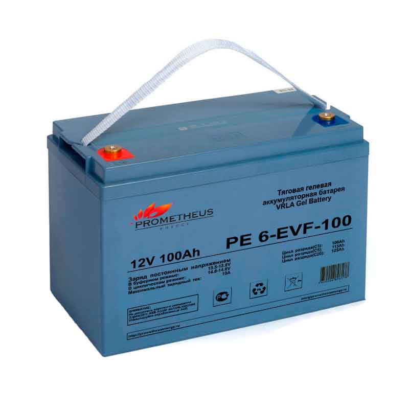**Аккумулятор тяговый Prometheus PE 6-EVF-100 (12V / 113Ah)**Тяговый аккумулятор Prometheus PE 6-EVF-100 выпускается напряжением 12 В и ёмкостью 113 Ач по технологии GEL — электролит загущен до желеобразного состояния. Это обеспечивает повышенную устойчивость аккумулятора к глубоким разрядами и воздействию температур. Батарея производится в прочном герметичном корпусе — обслуживание на протяжении всего срока службы не требуется. На крышке предусмотрен VRLA клапан, сбрасывающий избыточное давление. Тяговый аккумулятор Prometheus PE 6-EVF-100 подходит для большинства электрооборудования: велосипеды, самокаты, трициклы, тележки, инструменты, поломоечные машины, погрузочная и складская техника. При правильной эксплуатации батарея выдерживает до 700 циклов заряд-разряд при DOD = 80%. Дата производства аккумулятора Prometheus PE 6-EVF-100 указана на крышке в виде символьного кода. Технические характеристики АКБ Prometheus PE 6-EVF-100 Номинальное напряжение 12 В Число элементов 6 Саморазряд (при 20 °С) менее 3% в месяц Особенности аккумулятора Prometheus PE 6-EVF-100 Необслуживаемый аккумулятор (технология GEL) Устойчивость к длительным глубоким разрядам Широкий диапазон рабочих температур Не требует отдельной зарядной комнаты Применение аккумулятора Prometheus PE 6-EVF-100 Электросамокаты Погрузочно-разгрузочная техника Подъёмно-тяговая техника Складская техника Поломоечная техника Транспортировка Тяговый аккумулятор Prometheus PE 6-EVF-100 полностью безопасен при перевозке. Перед отправкой необходимо убедиться, что батарея не имеет никаких повреждений. Если на ней обнаружены трещины, следы протекания электролита и другие дефекты, то она должна быть отправлена на утилизацию. Использовать и перевозить такие аккумуляторы нельзя, это опасно. Соблюдайте температурный режим, не допускайте нагрева батарей от прямого солнечного света, отопительных приборов и других источников тепла. Клеммы на время перемещений должны быть защищены специальными колпачками. Класть что-либо поверх аккумулятора запрещено, они перевозятся на паллетах, уложенные в один ряд вертикально (крышкой вверх). При соблюдении всех рекомендаций Prometheus PE 6-EVF-100 является полностью безопасным при перевозке. Допускается использовать любой вид транспорта: воздушный, автомобильный, морской, речной, железнодорожный. Эксплуатация Внимательно изучите инструкцию по эксплуатации от производителя. Перед началом использования полностью зарядите аккумулятор. Prometheus PE 6-EVF-100 работает при температуре от -35 до +50 °C. Рекомендуется соблюдать температурный режим, это продлит срок службы батареи. Не снимайте с аккумулятора больше его заявленной ёмкости и не разряжайте его током, превышающим максимальный разрядный ток. Это опасно и может привести к разрушению батареи, серьёзным травмам и порче оборудования. Убедитесь, что техника полностью соответствует вашему аккумулятору. Избегайте глубоких разрядов, они негативно сказываются на характеристиках и сроке службы батареи. Подбирайте ёмкость с запасом в 20-30%, так изделие прослужит дольше. Заряд Полностью заряжайте Prometheus PE 6-EVF-100 после каждого использования. Убедитесь, что зарядное устройство полностью совместимо с аккумулятором. Рекомендуется заряжать автоматическим ЗУ, это позволит избежать недо- и перезаряда батарей. Оптимальный ток заряда составляет 10% от номинальной ёмкости батареи. Заряд при этом длится поряд