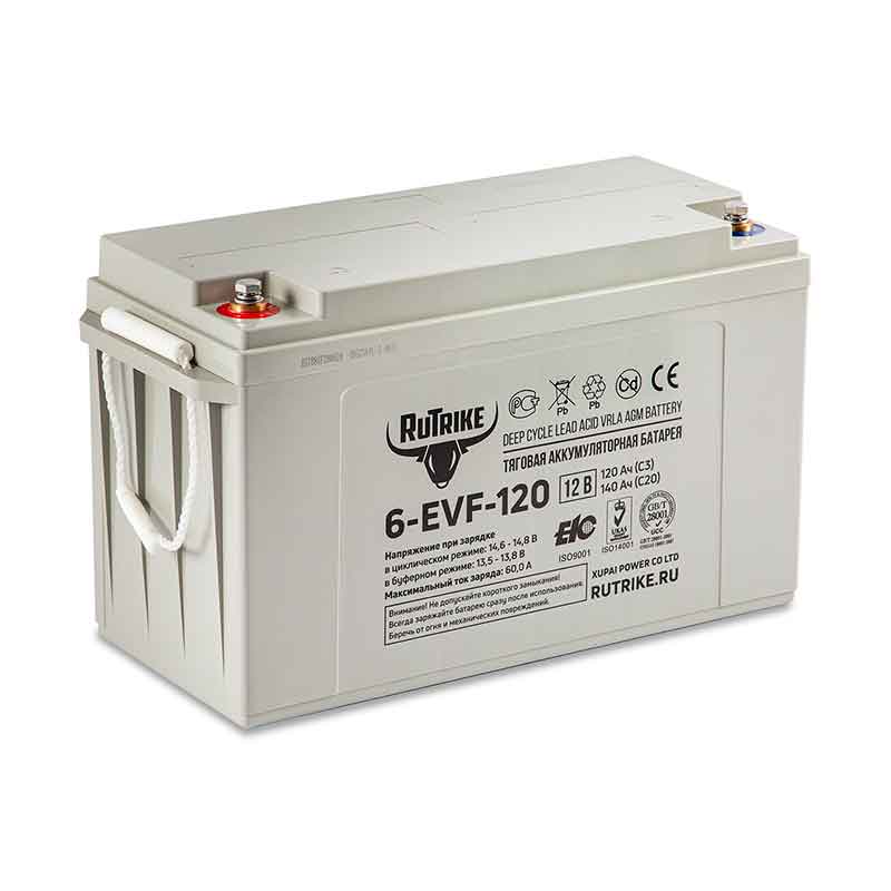 **Аккумулятор тяговый RuTrike 6-EVF-120 (12V / 128Ah C5) GEL**Свинцово-кислотный тяговый аккумулятор RuTrike 6-EVF-120 (ёмкость 140 Ач, напряжение 12 В) производится по технологии GEL и рекомендован для техники на электрической тяге. Электролит загущен до желеобразного состояния, благодаря чему батарея более устойчива к температурному воздействию и глубоким разрядам. Гелевые аккумуляторы отличаются повышенным числом циклов заряд-разряд: более 700 при DOD (глубине разряда) 80%. Пластины тягового аккумулятора снабжены более плотным активным материалом, благодаря этому они устойчивы к глубоким разрядам и не теряют ёмкость. Тяговый аккумулятор RuTrike 6-EVF-120 применяется в различной технике с электродвигателями. Корпус выполнен из ударопрочного ABS пластика и надёжно герметизирован. На крышке аккумулятора RuTrike 6-EVF-120 предусмотрен односторонний клапан избыточного давления. Дата производства аккумулятора RuTrike 6-EVF-120 указана на крышке в виде символьного кода. Технические характеристики АКБ RuTrike 6-EVF-120 Номинальное напряжение 12 В Число элементов 6 Максимальный разрядный ток (25 °С) - Внутреннее сопротивление полностью заряженной батареи (25 °С) - мОм Саморазряд (при 20 °С) менее 3% в месяц Срок службы в буферном режиме 5 лет Номинальная емкость (25 °С) 20 часовой разряд (0,06 А, 1,75 В/эл.) - 10 часовой разряд (0,12 А, 1,75 В/эл.) - 5 часовой разряд (0,23 А, 1,75 В/эл.) - Циклический режим (2,3–2,35 В) Максимальный зарядный ток 20 А Температурная компенсация - Буферный режим (2,23–2,27 В) Температурная компенсация- Диапазон рабочих температур Оптимальная рабочая температура 20–25 °С Разряд -20 °С ~ 50 °С Заряд -10 °С ~ 50 °С Хранение -20 °С ~ 50 °С Конструкция аккумулятора RuTrike 6-EVF-120 Компонент Материал Положительная пластина Диоксид свинца Отрицательная пластина Свинец Корпус и крышка Синтетическая смола ABS Клапан предохранительный Каучук Клеммы Медь Сепаратор Стекловолокно Электролит Серная кислота Особенности аккумулятора RuTrike 6-EVF-120 Увеличенное время поездки без подзаряда Устойчивость к глубоким разрядам Прочный огнестойкий корпус из ABS пластика Повышенная виброустойчивость Герметичная конструкция с VRLA клапаном Более 700 циклов при DOD 80% Применение аккумулятора RuTrike 6-EVF-120 Электросамокаты Электрические тележки Электровелосипеды Электромотоциклы Электроскутеры Электроинструменты Транспортировка батареи При соблюдении всех правил перевозки и рекомендаций изготовителя тяговые аккумуляторы RuTrike 6-EVF-120 полностью безопасны при транспортировке. Их допускается перевозить воздушным, морским, речным, автомобильным и железнодорожным транспортом. Батареи с трещинами, дефектами, следами протекания электролита и другими повреждениями перевозятся как опасный груз и до эксплуатации не допускаются. Перед транспортировкой убедитесь, что клеммы защищены специальными колпачками, а сами аккумуляторы расположены вертикально крышкой вверх. Не кладите ничего поверх изделий, не допускайте их падения и опрокидывания. Рекомендуемая температура на время перевозки +20-25 °С, не допускайте нагрева аккумуляторов от радиаторов отопления, солнечного света и других источников тепла. Заряд Внимательно и полностью изучите инструкцию изготовителя. Перед каждым использованием полностью заряжайте аккумулятор, это продлит срок его службы. Рекомендуется заряжать батарею током, равным 10% её номинальной ёмкости. Подзарядка таким током зан
