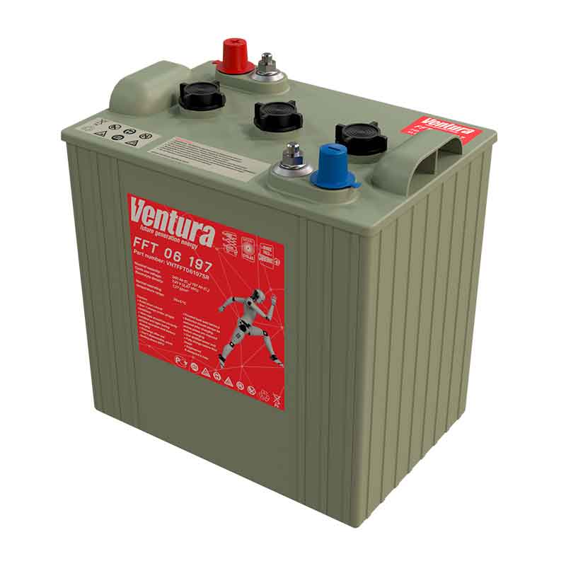 **Аккумулятор тяговый Ventura FFT 06 197 (6V / 197Ah C5) WET**Тяговый аккумулятор Ventura FFT 06 197 производятся ёмкостью C5 197 Ач и напряжением 6 В с применением технологии WET. Главная особенность этой батареи — продолжительный срок службы: до 1000 циклов при DOD = 60%. Внутри тягового АКБ Ventura FFT 06 197 расположены трубчатые пластины из специального сплава. Это обеспечивает быструю подзарядку батареи за счёт низкого внутреннего сопротивления. Тяговый аккумулятор Ventura FFT 06 197 разработан специально для работы в тяжёлых условиях. Эксплуатировать батарею можно даже в экстремальных условиях. Технические характеристики АКБ VENTURA FFT 06 197 Номинальное напряжение 6 В Число элементов 3 Саморазряд (при 20 °С) менее 3% в месяц Срок службы в буферном режиме до 15 лет Срок службы в циклическом режиме при глубине разряда 60% до 1000 циклов Диапазон рабочих температур Оптимальная рабочая температура 20–25 °С Разряд -40 °С ~ +60 °С Заряд -30 °С ~ +50 °С Хранение -30 °С ~ +60 °С Особенности аккумулятора VENTURA FFT 06 197 До 1000 циклов при DOD = 60% Быстрая подзарядка Прочные клеммы Панцирные пластины Для эксплуатации в тяжёлых условиях Применение аккумулятора VENTURA FFT 06 197 Подъёмники Складская и погрузочная техника Гольф-кары Электромобили Поломоечные машины Транспортировка Тяговый аккумулятор VENTURA FFT 06 197 является безопасным грузом и может перевозиться любым видом транспорта, в том числе и воздушным. Во время перевозки стоит соблюдать все правила и рекомендации от производителя. Не переворачивайте и не роняйте батареи, устанавливать их разрешается только на дно, размещать что-либо сверху или класть один на другой категорически запрещено. Поднимать изделия металлическими тросами и использовать вблизи клемм другие токопроводящие вещи и инструменты не допускается. Сами клеммы должны быть снабжены специальными защитными колпачками. Не допускайте нагрева батарей от прямого солнечного света и других источников тепла. Перед началом транспортировки убедитесь, что аккумуляторы не имеют повреждений и следов протечки электролита. Заряд Перед каждым вводом в эксплуатацию необходимо полностью зарядить батарею. Рекомендуется использовать автоматическое зарядное устройство, значение тока заряда должно соответствовать 10% от ёмкости аккумулятора на протяжении 9-12 часов. После завершения зарядки ЗУ переходит в режим компенсации саморазряда батареи. При использовании в цепи двух и более аккумуляторов необходимо выполнить выравнивающий заряд. Рекомендуется производить его каждые полгода. Особое внимание необходимо уделить температурному режиму. При разрядке батареи ниже 0 °С во избежание замерзания аккумулятора незамедлительно установите его на зарядку. Если температура равна или превышает рекомендуемую производителем, дайте батарее остыть перед подзарядкой. В таблице представлены рекомендуемые параметры заряда батареи: Температура окружающей среды, °С Напряжение заряда аккумуляторной батареи, В/элемент Время заряда, ч 5 2.31 7 2.46 4 20 2.25 7 2.40 4 35 2.21 7 2.34 4 Монтаж и эксплуатация Перед вводом в эксплуатацию необходимо внимательно осмотреть корпус на наличие трещин, следов протекания электролита и других дефектов. Повреждённые аккумуляторы к работе не допускаются и должны быть утилизированы. Не стоит забывать о большом удельном весе самих батарей, особенно во время монтажа и их переноса. К работе с изделиями допу
