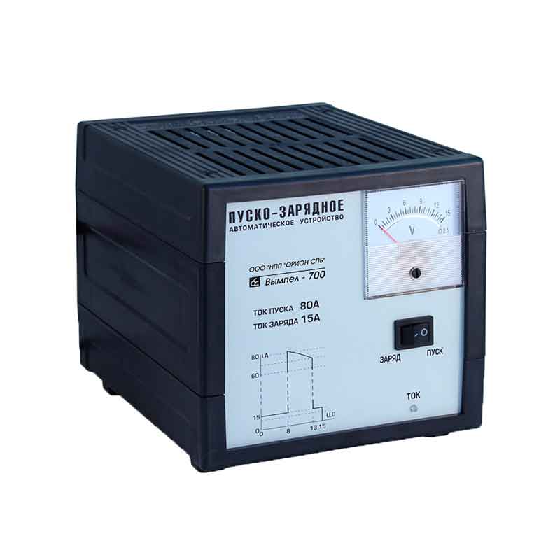 **Зарядное устройство Вымпел-700**Автоматическое зарядное устройство Вымпел-700 предназначено для зарядки 12 В автомобильных аккумуляторов любой ёмкости более 45 Ач. ЗУ использует алгоритм заряда по принципу импульсного отключения и снабжено защитой от короткого замыкания и перегрева. На передней панели расположен стрелочный вольтметр для отслеживания состояния аккумуляторов. Регулировка тока и напряжения на Вымпел-700 отсутствует. Во избежание перегрева внутри зарядного устройства установлено активное охлаждение в виде микровентилятора. Более подробную информацию о схеме подключения, режимах эксплуатации и характеристиках можно получить во вкладке «Документы». Особенности ЗУ Вымпел-700: Электронная защита от перегрева Защита от КЗ Подзарядка полностью разряженных АКБ Применение ЗУ Вымпел-700: Для автомобильных АКБ Заряжает батареи любой ёмкости более 45 Ач Свинцово-кислотные батареи Технические характеристики зарядного устройства Вымпел-700 Алгоритм заряда импульсное отключение Номинальное напряжение АКБ 12 В Максимальный зарядный ток, А 15 Регулировка тока нет Максимальный пусковой ток, А 80 Регулировка напряжения нет Напряжение заряда, В 15 Индикатор заряда стрелочный вольтметр Охлаждение активное (микровентилятор) Электронная защита от короткого замыкания, перегрева Использование в качестве блока питания да Использование в качестве пускового устройства да Напряжение питания 220В / 50Гц AC Габариты, мм 155х195х160 Вес, кг 2,4Преимущества:- Надёжность и качество от производителя- Категория: Зарядные устройства|Зарядные устройства>Зарядные устройства (ЗУ) ВымпелДоставка по Казахстану. Гарантия и сервисное обслуживание.Нужна консультация — наши специалисты помогут подобрать оптимальную модель.